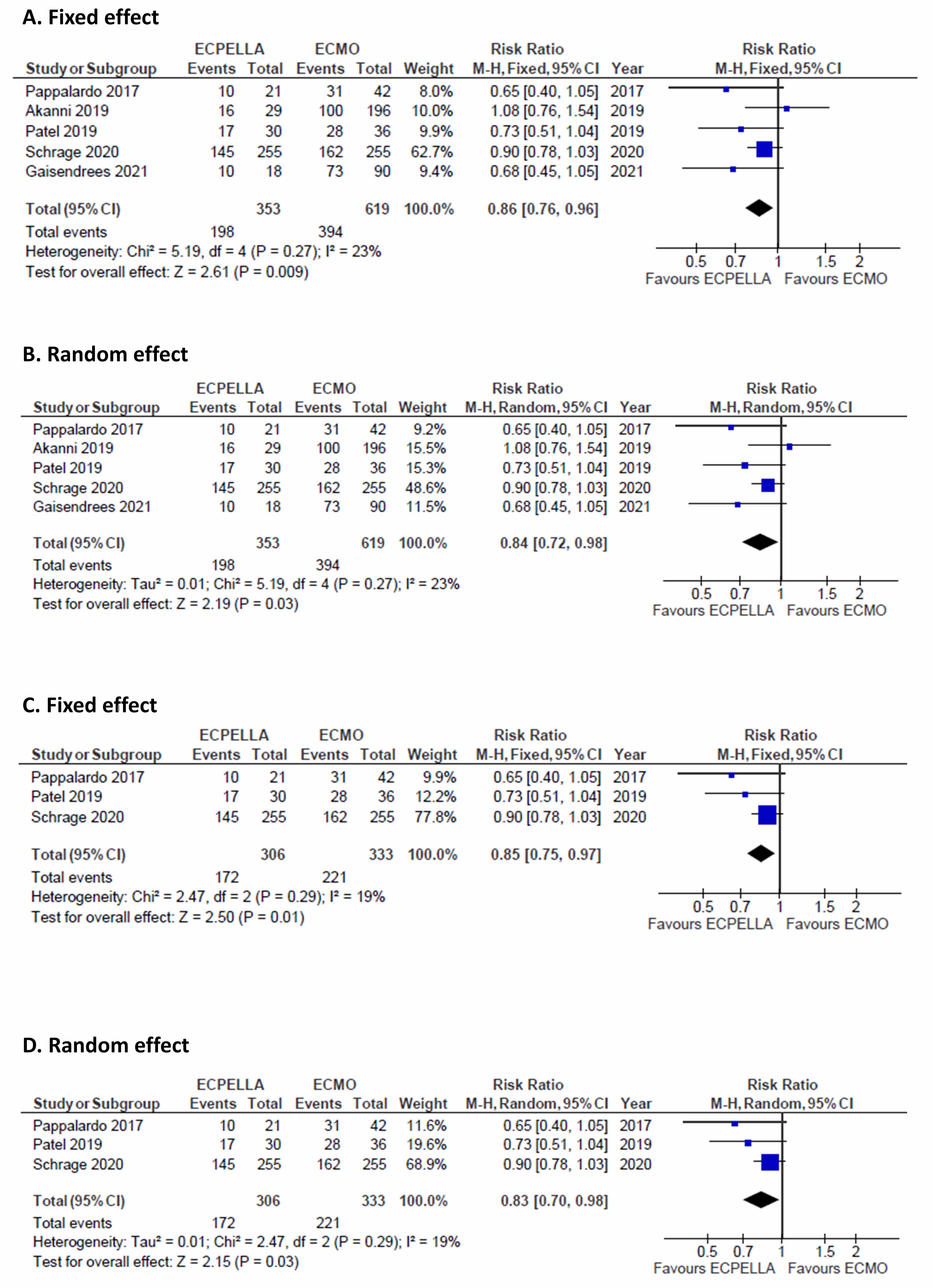 Fig. 3.Primary outcome. (A) All cause-mortality assessed with fixed effect meta-analysis including the five selected studies [11, 12, 13, 14, 15]. (B) All cause-mortality assessed with random effect meta-analysis including the five selected studies [11, 12, 13, 14, 15]. (C) All cause-mortality with fixed effect meta-analysis including propensity matched or homogeneous population studies [11, 12, 13]. (D) All cause-mortality with random effect meta-analysis including propensity matched or homogeneous population studies [11, 12, 13]. M-H, Mantel-Haenszel; CI, confidence interval; ECMO, extracorporeal membrane oxygenation; ECPELLA, ECMO + Impella.
