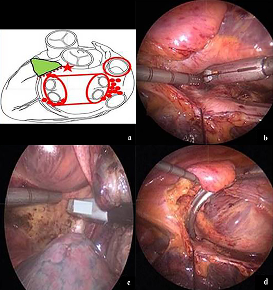 Fig. 1.Surgical intervention using total thoracoscopic ablation. (a) Intervention site for ablation. (b) Roof line ablation. (c) Ganglionated plexi ablation. (d) Superior vena cava circular ablation.