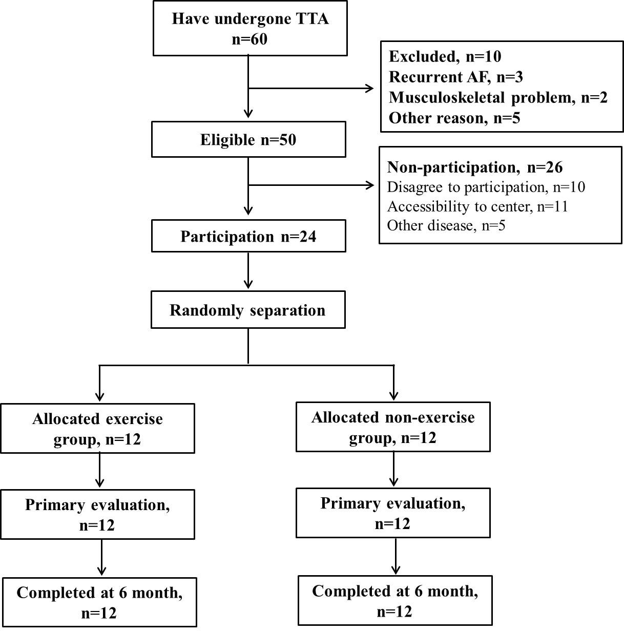 Sixty patients treated at Samsung Medical Hospital (Seoul, Republic of Korea) with TTA were enrolled for this study. We excluded subjects with recurrent AF (n = 3) and musculoskeletal problems (n = 2); we also excluded patients for other reasons (n = 5). Other reasons for exclusion included self-reported reasons for non-participation in clinical trial due to lack of interest (n = 10), long distances to the center from home (n = 11), and inability to exercise due to disease (n = 5). Twenty-four patients consented to this study and all patients completed this eight weeks intervention (Fig. 2). Persistent AF was the superior type between the groups (67%), followed by the paroxysmal type (33%). The rate of previous cardioversion treatment was 50% in the intervention group and 42% in the control group and that of advanced intervention as cardioversion was 17% and 8%, respectively (Table 1).