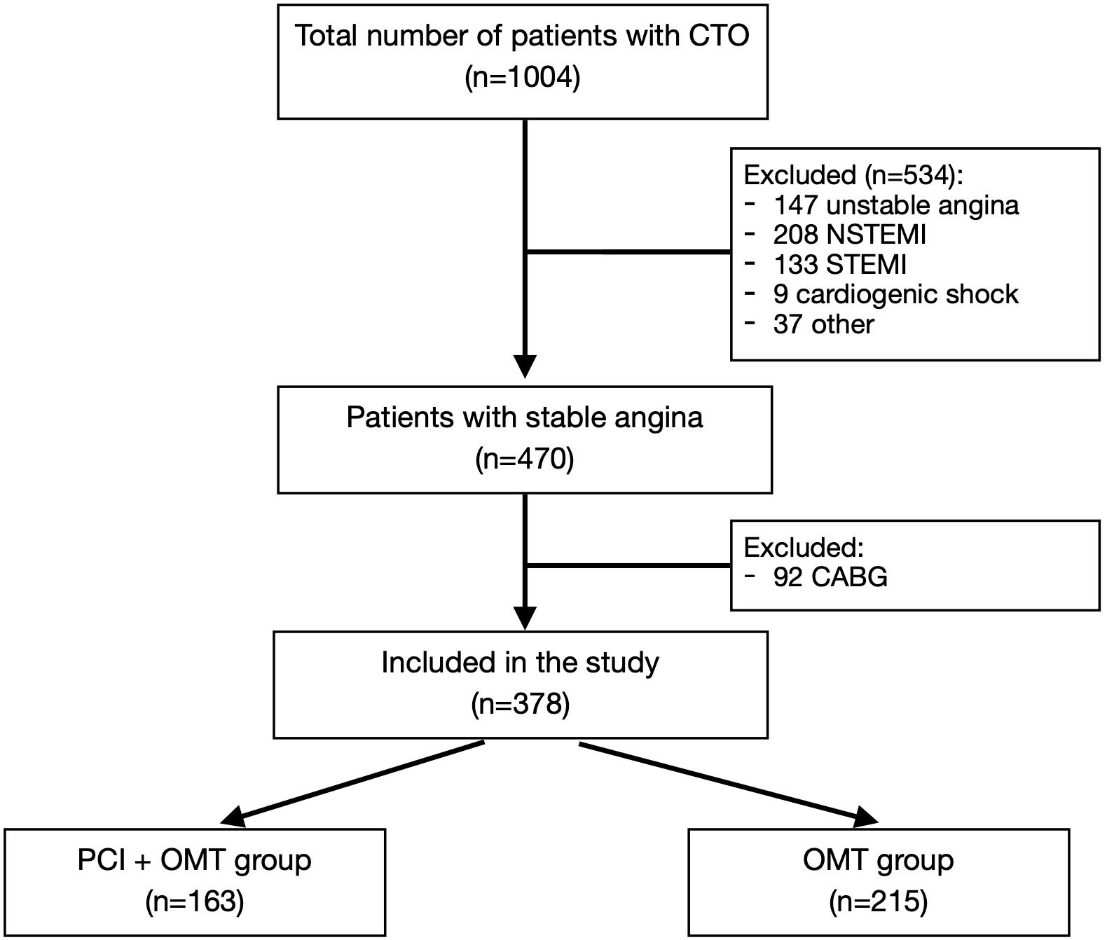 were divided into two groups: CTO PCI + OMT (n = 163) and OMT alone (n = 215).