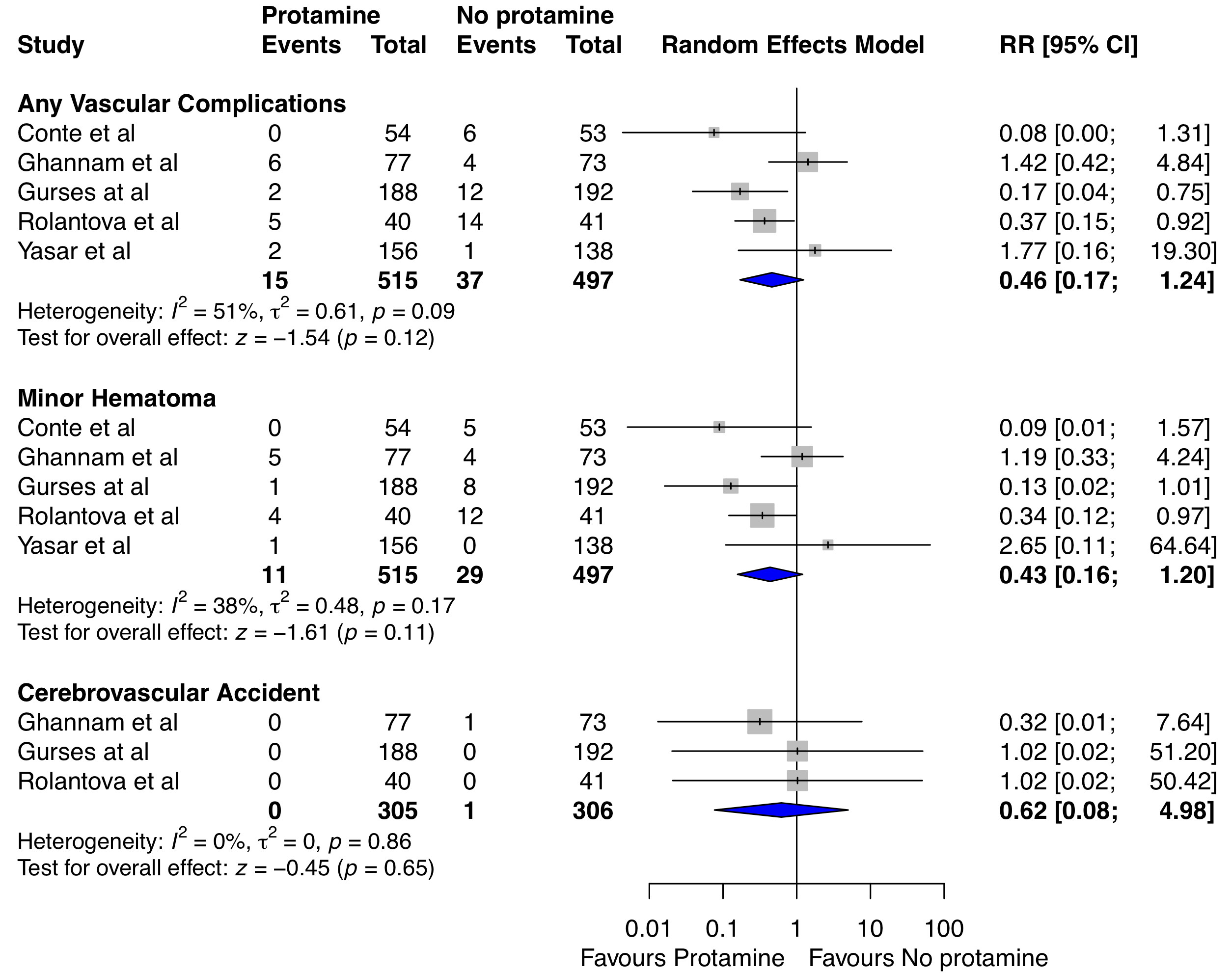 The results of our pooled analysis demonstrate a significant reduction in time to hemostasis and time to ambulation with a mean of 13 minutes and 176 minutes, respectively, with the use of protamine following AF ablation. There was a positive trend in decreasing the risk of vascular complications and CVA with protamine administration, although this difference did not reach statistical significance due to inadequate power and low event rates (Fig. 3).