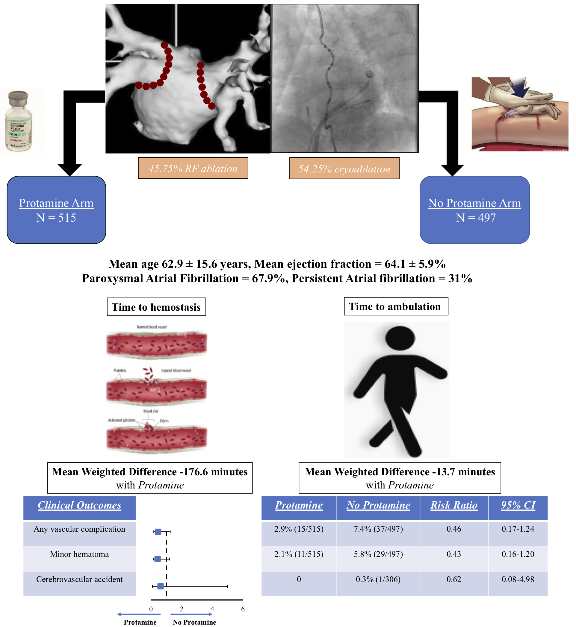 Therapeutic anticoagulation with unfractionated heparin (UFH) during atrial fibrillation (AF) ablation is critical to minimize procedure-related thromboembolic complications [1]. The 2017 HRS/EHRA/ECAS/APHRS/SOLAECE, an expert consensus statement on catheter ablation of AF, recommends protamine to neutralize effects of heparin and hasten hemostasis to avoid vascular complications such as aneurysm, fistula, and hematoma (Class IIa, based on moderate quality of evidence) [1]. However, its safety profile and efficacy in promoting faster patient recovery are still unclear. We performed a systematic review and meta-analysis to determine the effectiveness of protamine to expedite vascular hemostasis and ambulation in patients undergoing AF ablation.