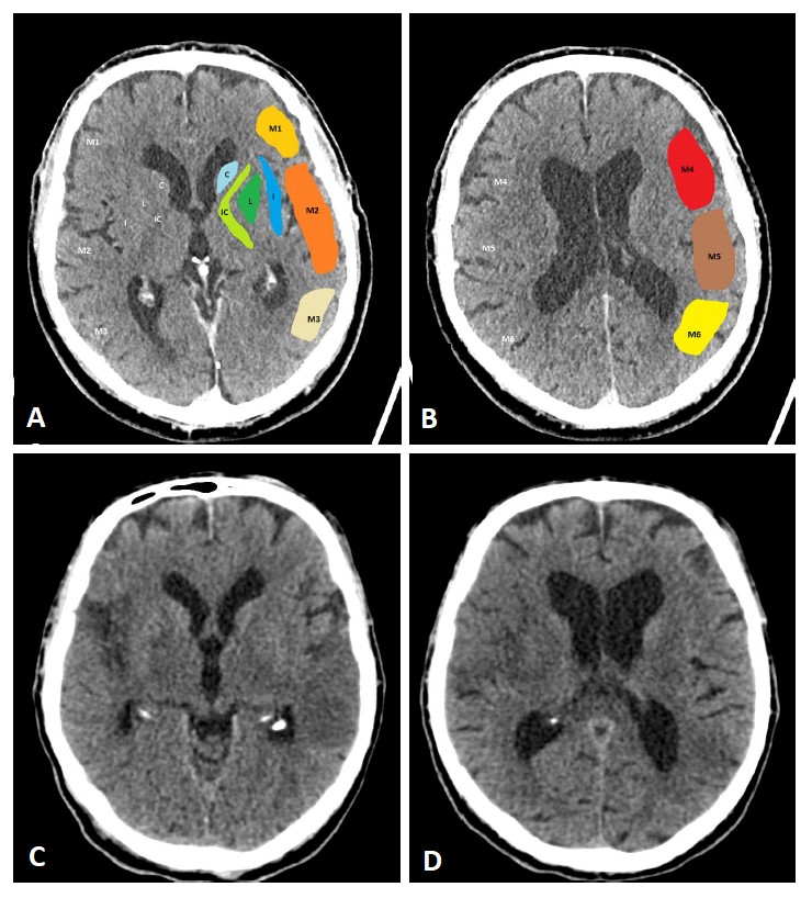 Fig. 1.ASPECTS. Visualization of the ASPECTS territories (A,B). The following areas are covered: M1 (anterior MCA cortex, frontal operculum), M2 (anterior temporal lobe, laterally to the insula), M3 (posterior temporal lobe, posterior MCA cortex), M4 (anterior MCA cortex superior to M1), M5 (lateral MCA cortex superior to M2), M6 (posterior MCA cortex superior to M3), insula (I), internal capsule (IC), caudate (C), and lentiforme nucleus (L). Each area accounts for 1 point. The maximum ASPECTS score is 10. Hypodensity in a described area leads to a deduction of one point. (C,D) show an example of CT ASPECTS. Hypodensity in the M2 and M6 areas is observed. Total ASPECTS: 8.