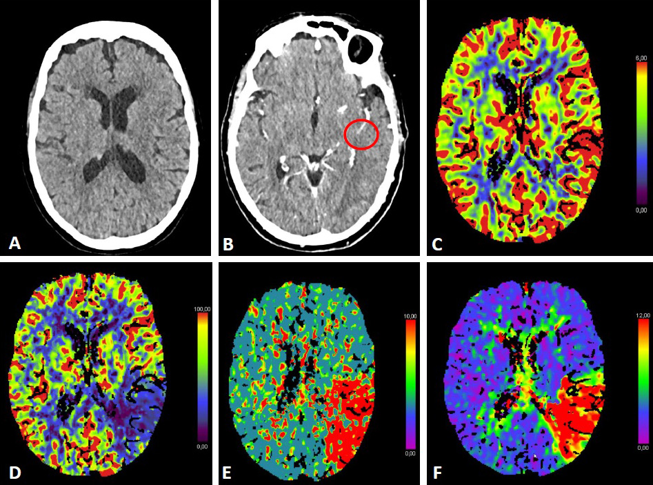 Fig. 2.CT-Perfusion. NCCT ASPECTS 10 (A). CT-A with M2-occlusion (B).