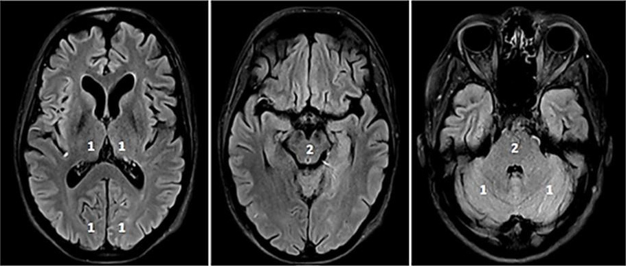 Fig. 3.pc-ASPECTS (posterior circulation ASPECTS). The pc-ASPECTS is a 10-point score evaluating the extent of ischemia in the posterior circulation. Scores of 10 points indicate no signs of ischemia in NCCT or MRI (diffusion weighted imaging, DWI). Each thalamus, occipital lobe and cerebellar hemisphere accounts for 1 point, and the mesencephalon and pons account for 2 points. Fig. 3 shows fluid attenuated inversion recovery (FLAIR) sequences because of better image quality.