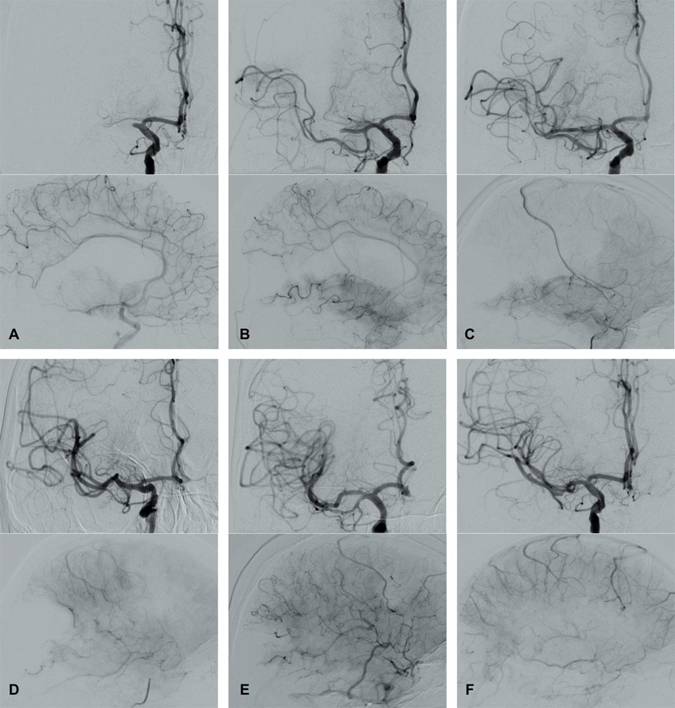 Fig. 4.Modified Thrombolysis in Cerebral Infarction (mTICI) grading system for evaluating the therapeutic success of IVT. No perfusion of the right MCA - mTICI 0 (A). Antegrade reperfusion past the initial occlusion with only filling of a temporal branch of the right MCA - mTICI 1 (B). Antegrade reperfusion of only the superior division of the right MCA - mTICI 2a (C). Antegrade reperfusion of more than half of the previously occluded right MCA territory with persistent filling defect parieto-occipital - mTICI 2b (D). Near complete perfusion except for some distal emboli in several distal cortical vessels frontal and occipital - mTICI 2c (E). Complete antegrade reperfusion of the previously occluded right MCA - mTICI 3 (F).