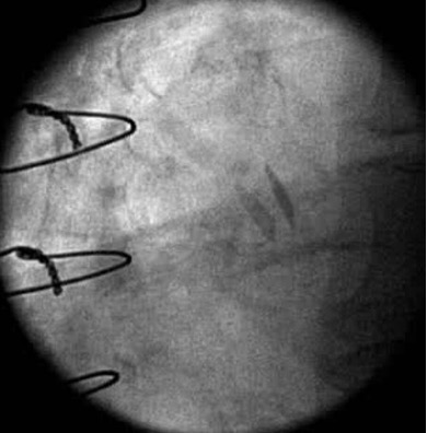 Fig. 1.Maximal opening of a 21 mm SJM Regent Mechanical Heart Valve in the aortic position with normal valve function. Fluoroscopy demonstrated brisk and complete opening and closing of the leaflets. Note the leaflets are not quite 90 degrees perpendicular to the annular plane at the time of maximal opening which still is within normal limits.
