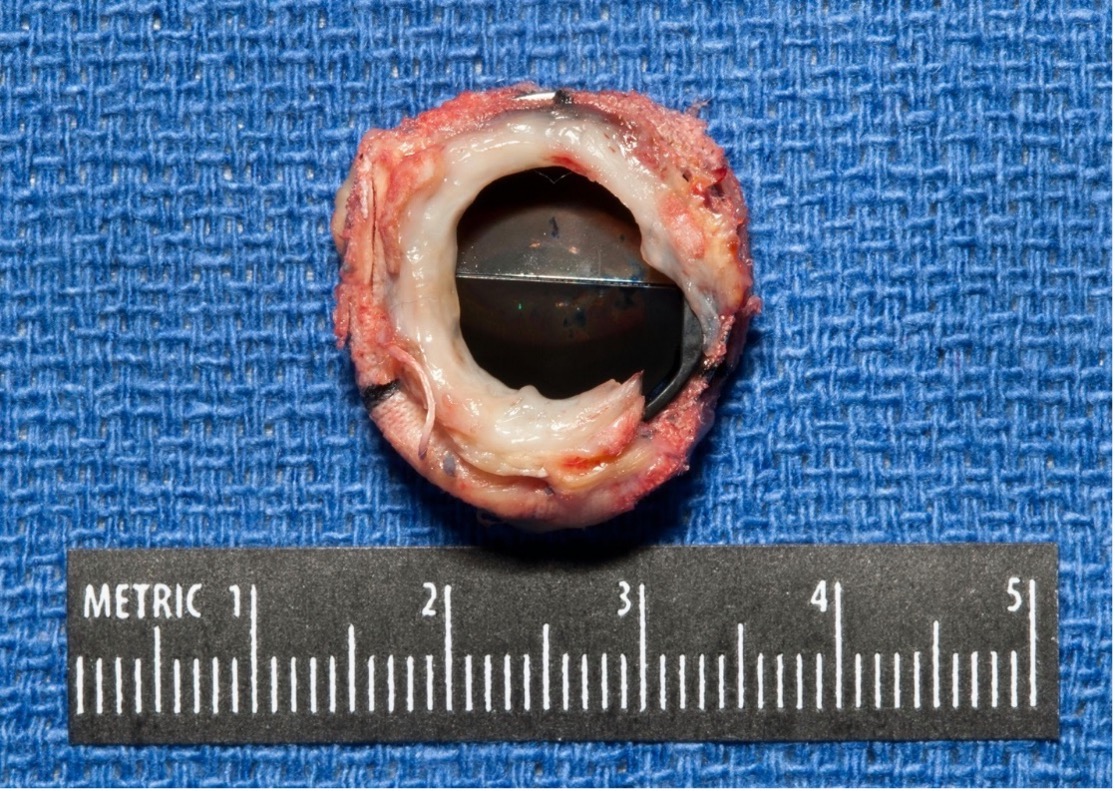 Fig. 2.An image of a prosthetic aortic valve with subvalvular pannus ingrowth leading to significant obstruction and stenosis after valve explant. The orifice area of the surgical specimen showed excellent correlation with calculated orifice area via Doppler echocardiography.