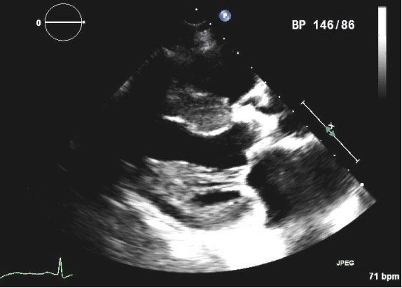 Fig. 3.Parasternal long axis view of a four year old 21 mm St Jude Trifecta pericardial aortic valve in a patient who presented with progressive exertional dyspnea and presyncope and was found to have severe prosthetic obstruction. Note the highly echogenic aortic bioprosthesis, suggesting a heavily calcified valve with stenotic orifice, which was confirmed during valve replacement.
