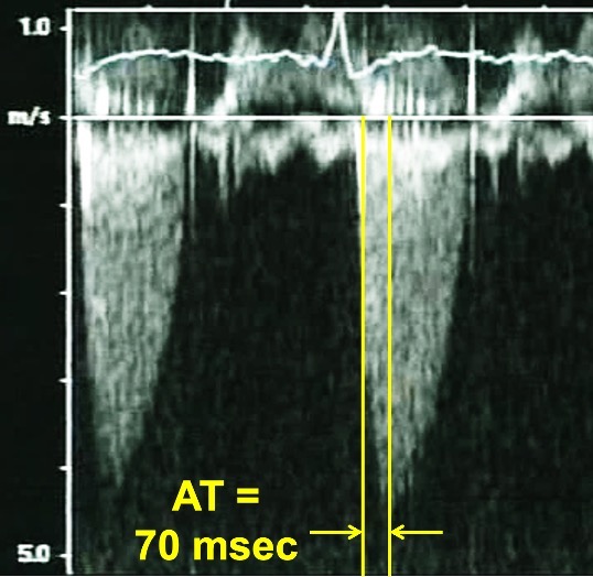 Fig. 4.Continuous Wave Doppler of a normally functioning aortic prosthesis with functionally obstructive hemodynamics. Note the triangular contour of the Doppler jet with a rapid acceleration time (AT) of 70 msec.