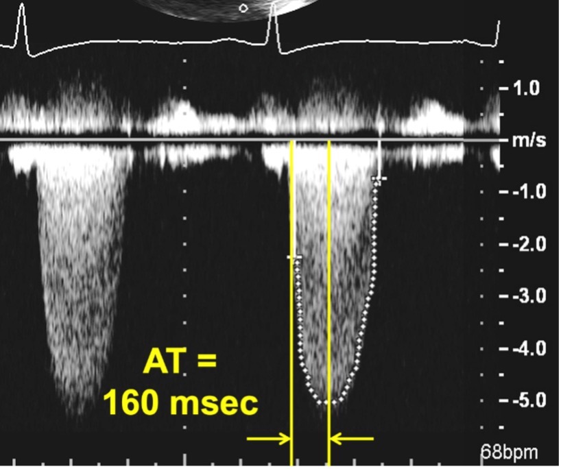 Fig. 5.Continuous Wave Doppler of an aortic prosthesis with structurally obstructive hemodynamics. Note the rounded contour of the Doppler jet, with an acceleration time (AT) of 160 msec.