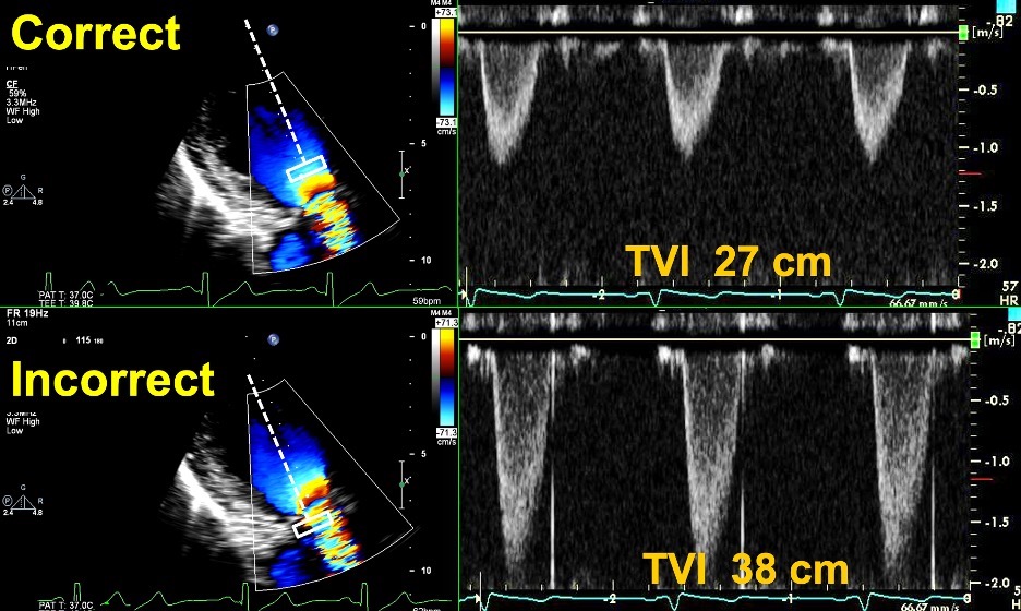 Fig. 6.Correct and Incorrect method of measuring the TVI of the LVOT. Top Images: Pulse Wave Doppler with sample volume placed immediately proximal to the zone of flow acceleration within the LVOT, with an accurate TVI of 27 cm. Bottom images: Pulse Wave Doppler with sample volume placed within the zone of flow acceleration leading to a spuriously elevated TVI of 38 cm. This can lead to an elevated DVI in a patient with an obstructive prosthesis, and care should be taken to avoid this error.