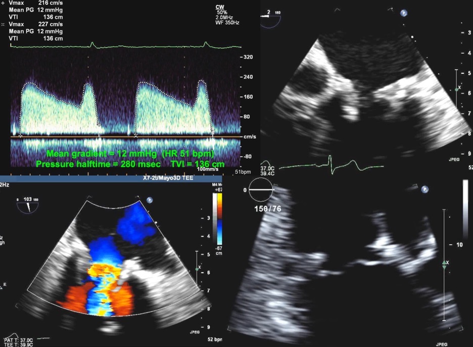 Fig. 7.Echocardiographic imaging of a patient with a mitral bioprosthesis and heart failure symptoms found to have prosthetic thrombosis.