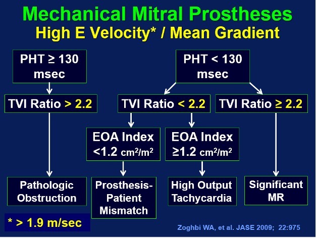 Echocardiographic parameters that should be measured during a complete mitral prosthesis evaluation include the peak mitral inflow velocity, the mean pressure gradient, pressure half time (PHT), DVI, and EOA (Table 2). Because transmitral velocities and gradients are dependent on heart rate (HR), the HR should be noted on every report to contextualize the hemodynamic findings. Left atrial, left ventricular, and right ventricular enlargement or dysfunction or an elevated pulmonary artery systolic pressure can also hint at underlying mitral prosthetic dysfunction.