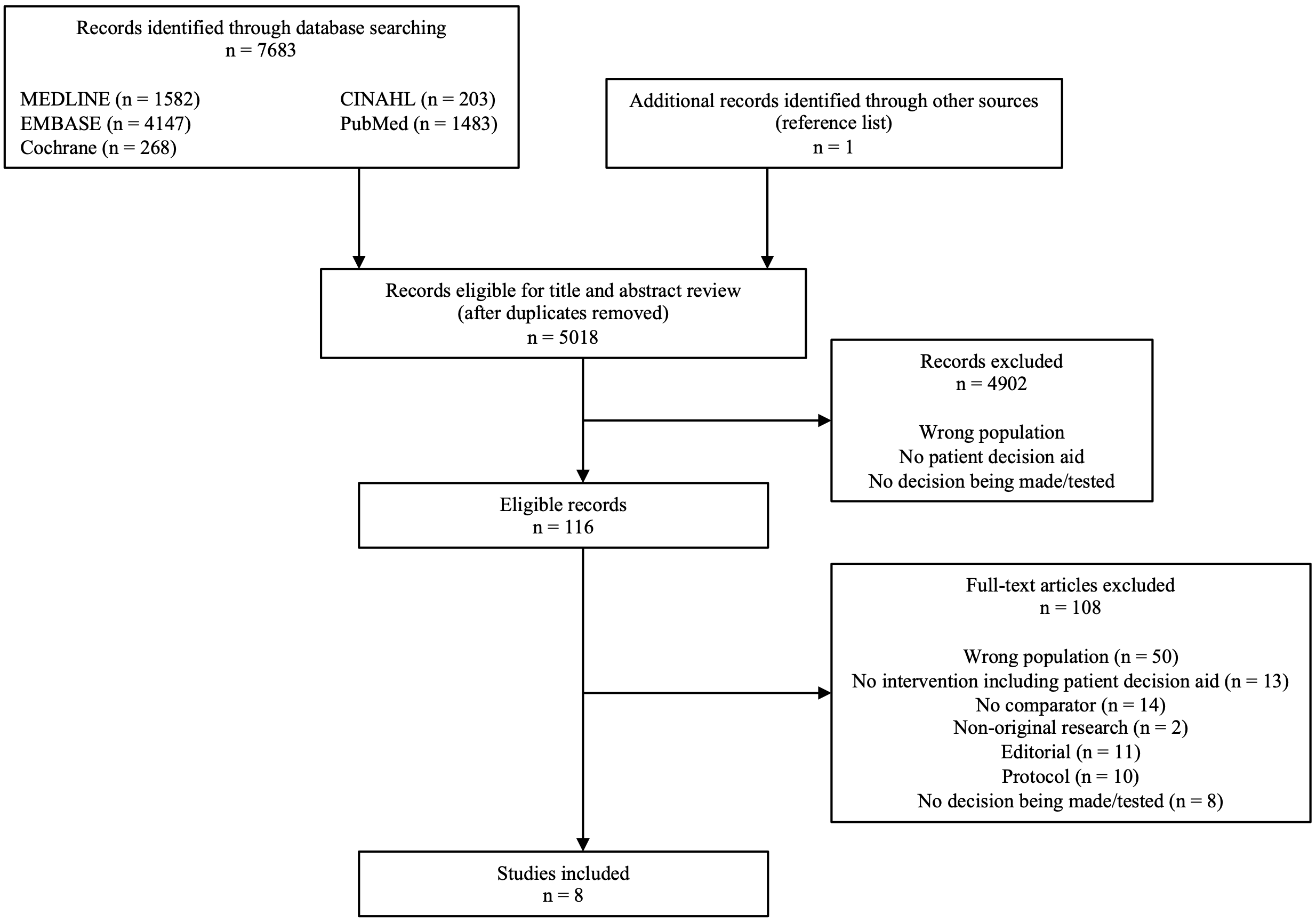 From the 7683 records identified through the database search, 5018 unique citations were initially identified for title and abstract review (see Fig. 1). Following stage 1 review, 116 manuscripts were selected for full-text review. We excluded 108 articles during the full-text review, for the reasons listed in Fig. 1. The most common reason for exclusion was for incorrect study population (n = 50). Eight studies met all entry criteria and were included in the qualitative review.