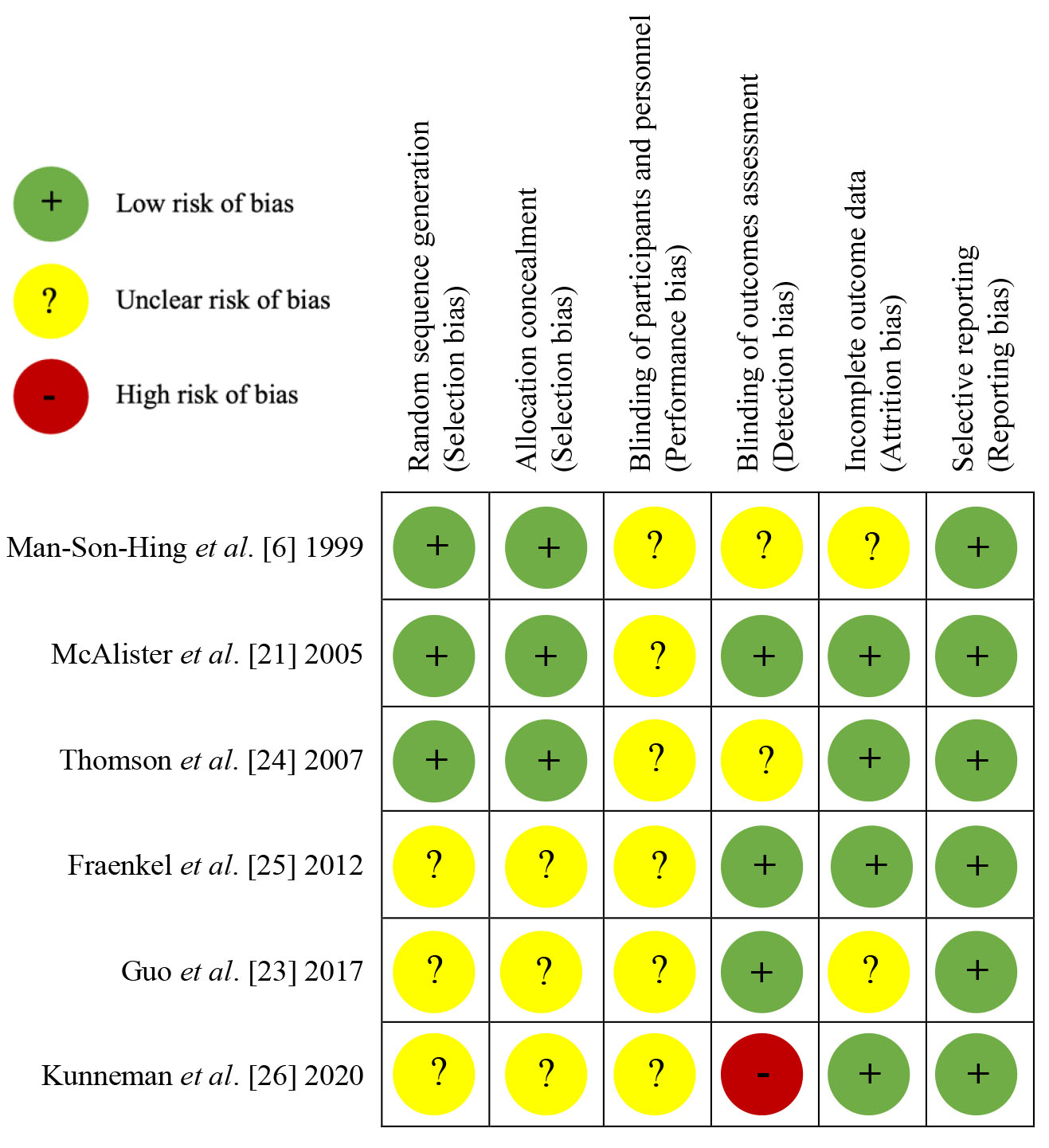 Fig. 3.Risk of bias summary for each included randomized trial. Summary of risk of bias assessment of included randomized trials conducted using the Cochrane Collaboration’s Risk of Bias tool [18]. Green circles with a ‘+’ indicate low risk of bias, yellow circles with a ‘?’ indicate unclear risk of bias and red circles with a ‘-’ indicate high risk of bias.