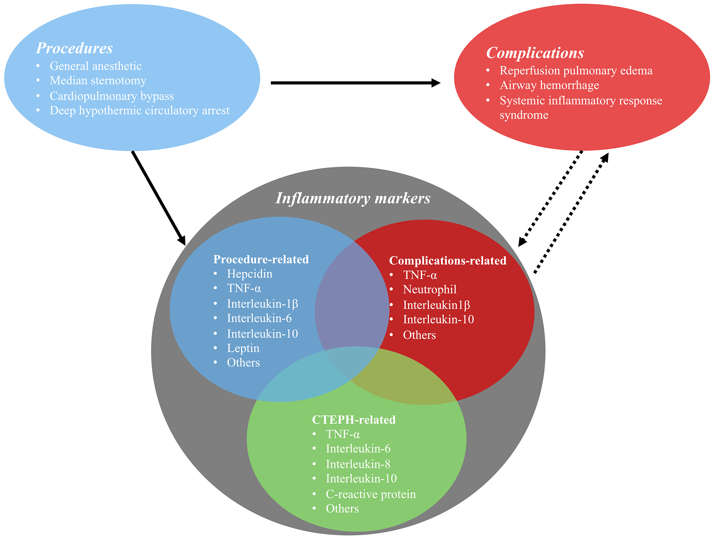 Pulmonary endarterectomy (PEA) surgery has been the primary treatment option for patients suffering from chronic thromboembolic pulmonary hypertension (CTEPH) [1]. PEA was first proposed and popularized by a team from the University of California in San Diego, USA [2]. PEA surgery can clear organized thromboembolic materials and enhance the hemodynamic index of pulmonary circulation and prognosis among CTEPH patients [3, 4]. However, some potential complications are causing early postoperative mortality rates of 5%–23% [5]. It has been reported that PEA-associated hemodynamic instability during the perioperative period was usually correlated with cytokines overstimulation [6]. Additionally, several studies have revealed that the blood samples of CTEPH patients after PEA surgery contained a lot of inflammatory factors and cytokines [5, 7, 8]. With an increasing number of reports regarding PEA inflammation, it is essential to review recent data for further understanding the implications of PEA that are beneficial for patients.