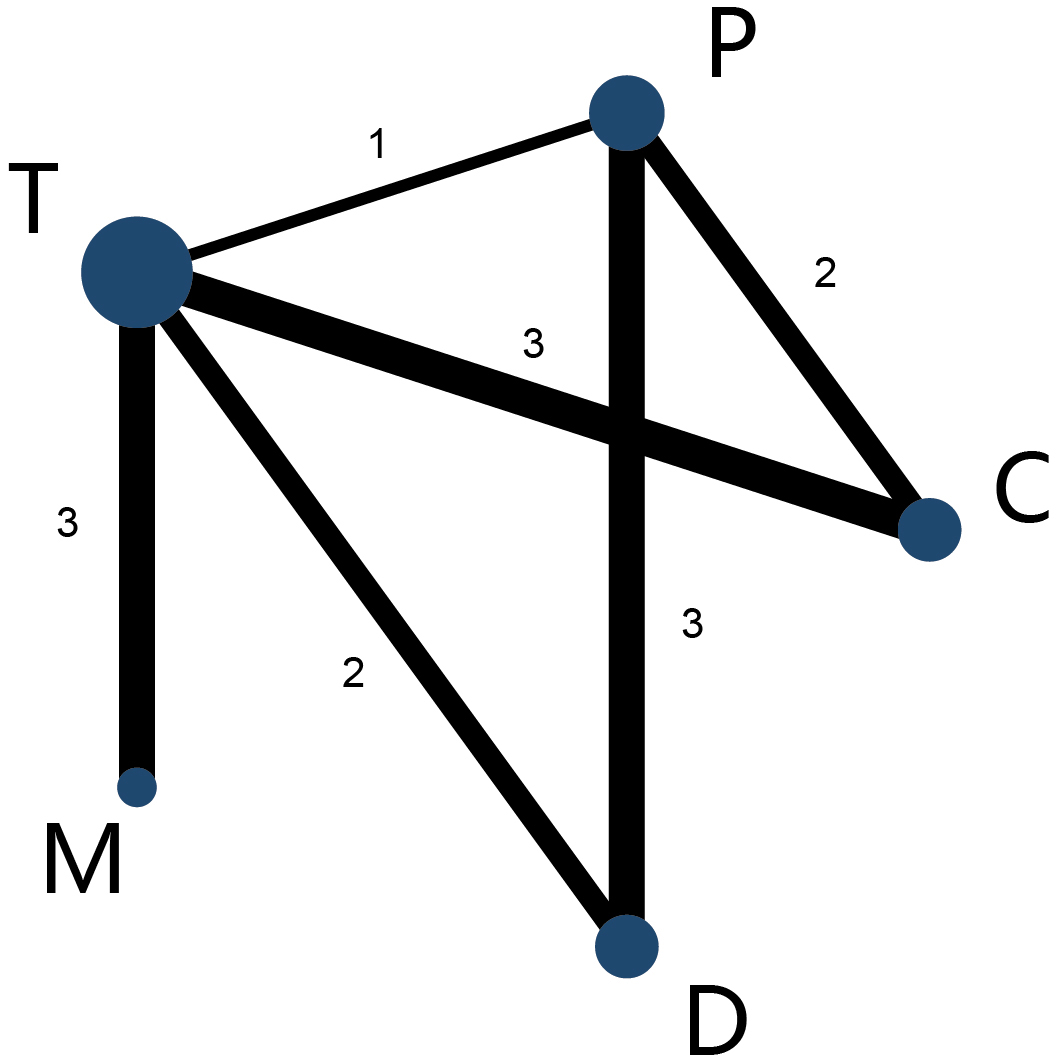 Five antiplatelet strategies were compared: clopidogrel combined with aspirin (C group), prasugrel combined with aspirin (P group), ticagrelor plus aspirin (T group), ticagrelor monotherapy (M group); DAPT de-escalation (D group). The network plot of the net adverse clinical events for different antiplatelet regiments was constructed in our study (Fig. 1).