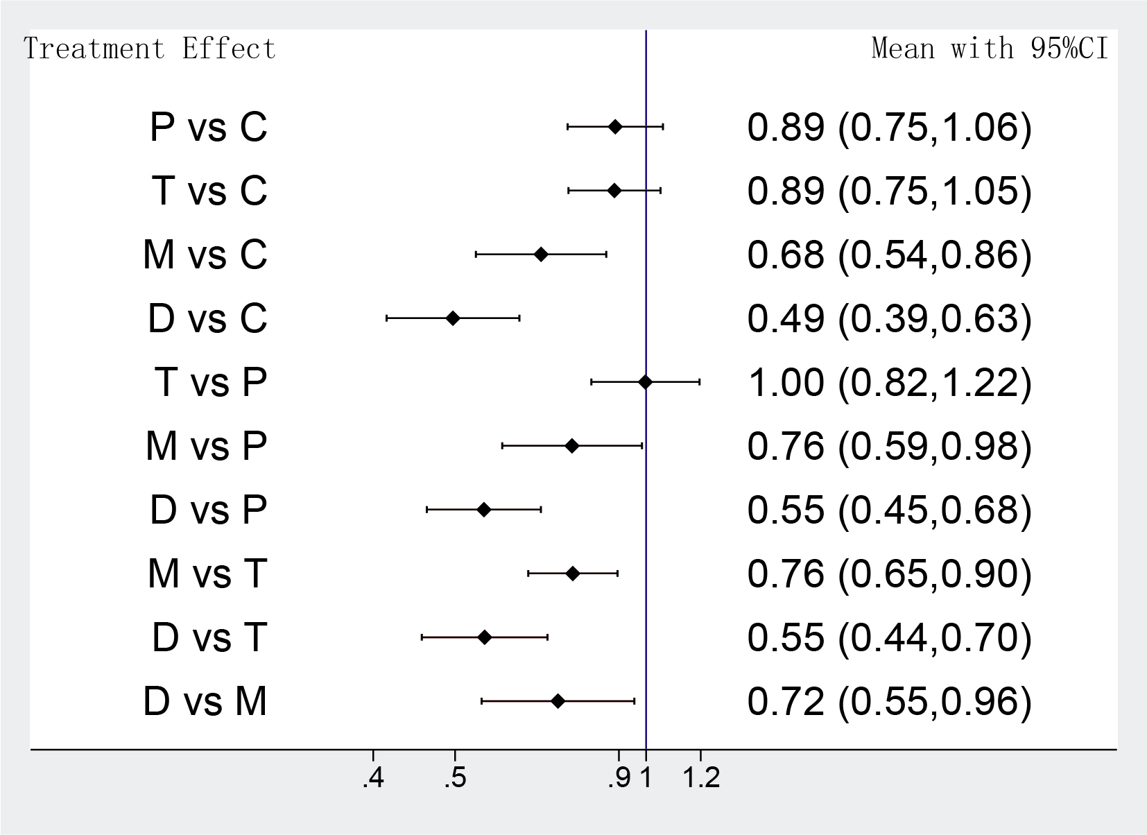 Fig. 3.Network meta-analysis results of MACEs. Values are expressed as OR (95% Confidence Intervals). C, clopidogrel + aspirin; P, prasugrel + aspirin; T, ticagrelor + aspirin; D, de-escalation; M, P2Y12 Inhibitor monotherapy.