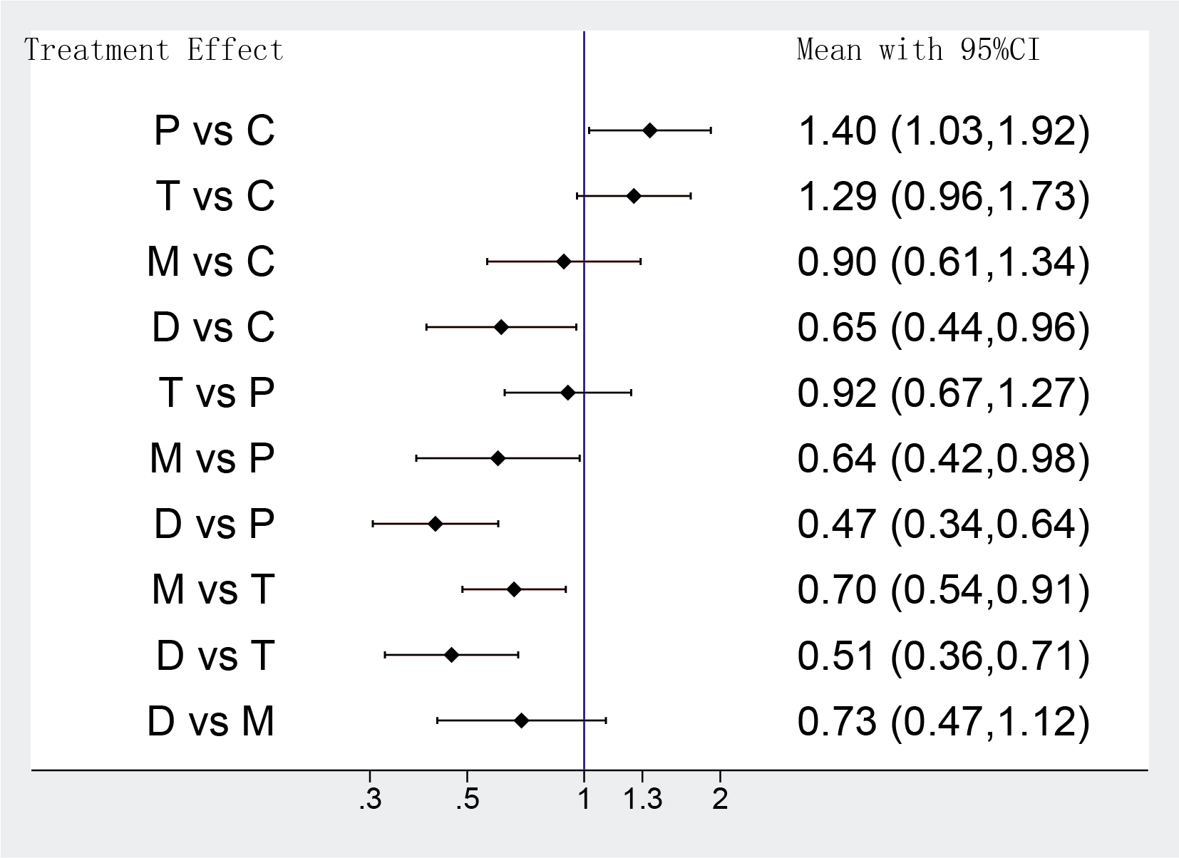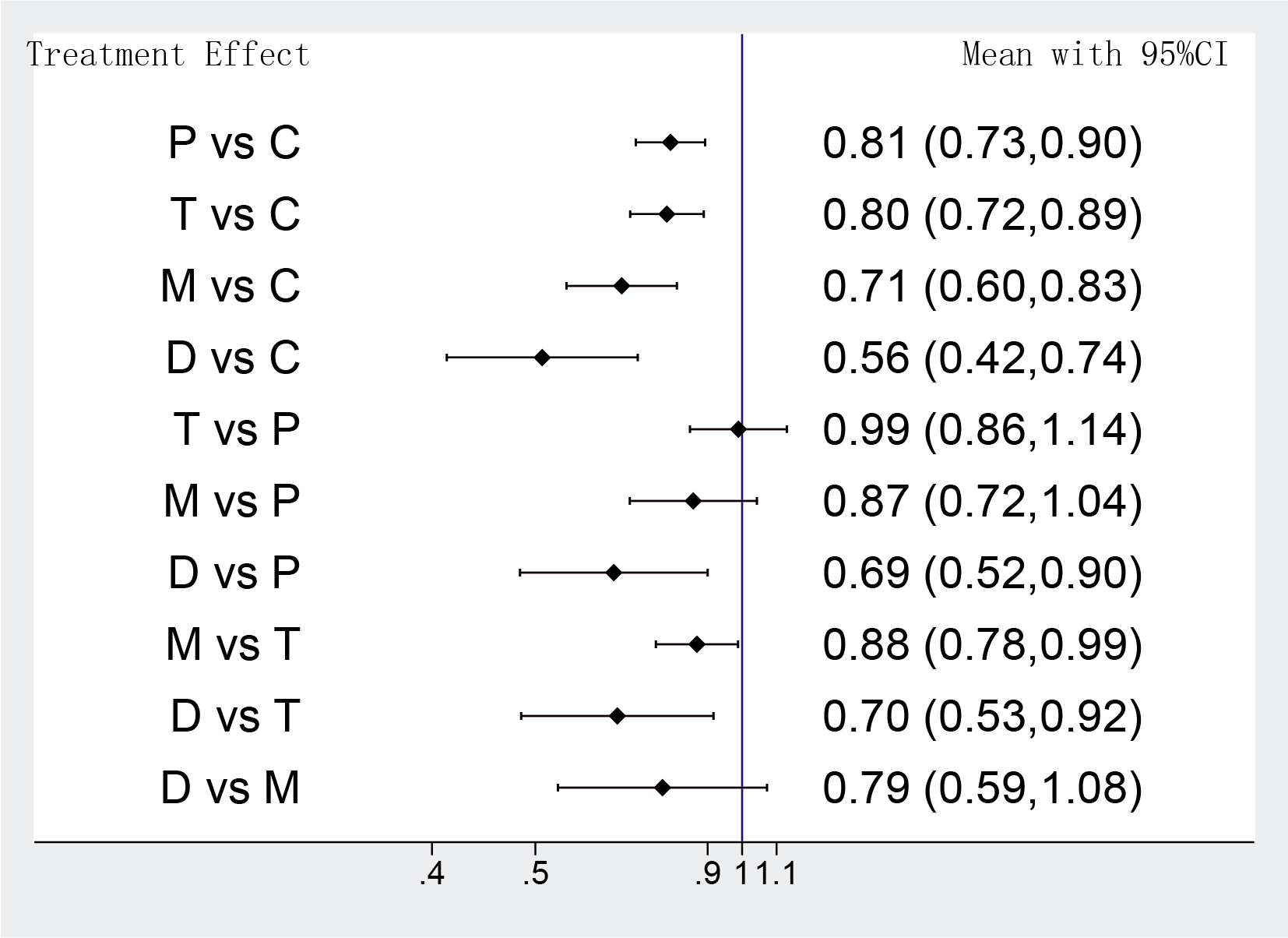 vs T group OR: 0.88 95% CI: 0.78–0.99; D group vs P group OR: 0.69 95% CI: