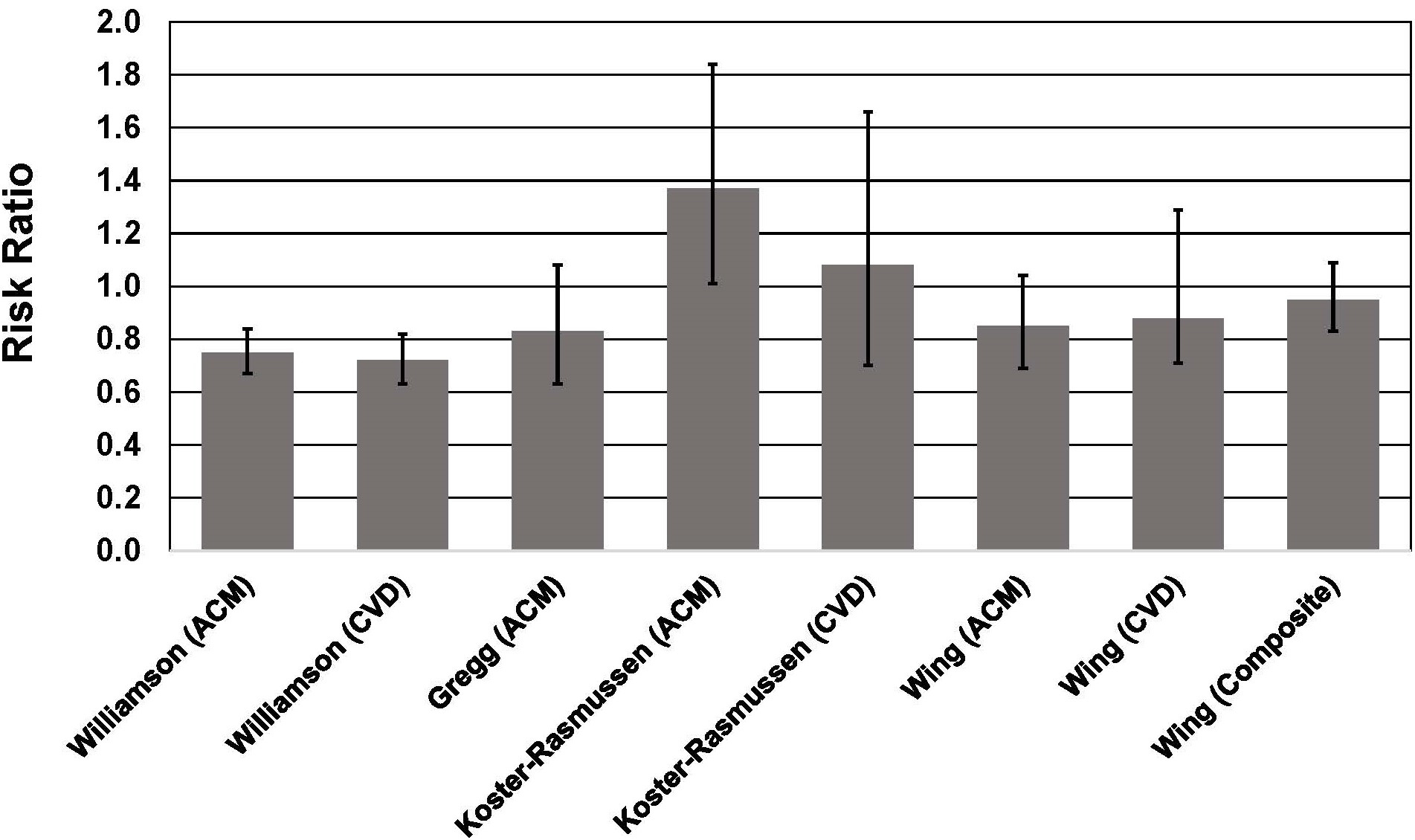 Fig. 1.Association between intentional weight loss and mortality risk in individuals with type 2 diabetes. See text for description of studies. Vertical bars = 95% confidence intervals. ACM, All-cause mortality; CVD, cardiovascular disease mortality. In the study by Wing et al. [50], composite = death from cardiovascular causes, nonfatal myocardial infarction, nonfatal stroke, or hospitalization for angina.