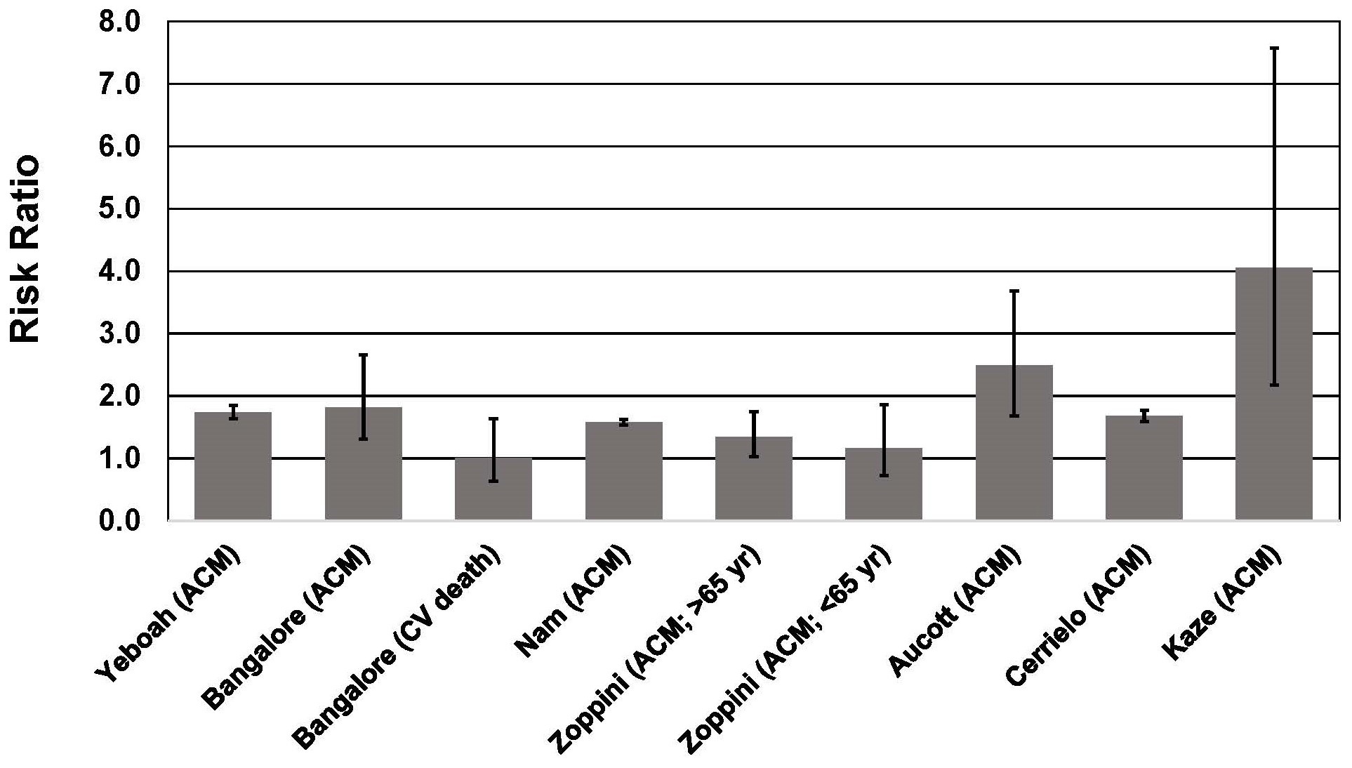 Fig. 2.Association between body weight fluctuation (weight cycling) and mortality risk in individuals with type 2 diabetes. See text for description of studies. Vertical bars = 95% confidence intervals. ACM, All-cause mortality; CV, cardiovascular. In the study of Kaze et al. [55], a 15.28-fold higher risk of CVD mortality is not shown for purposes of maintaining scale on the y-axis.