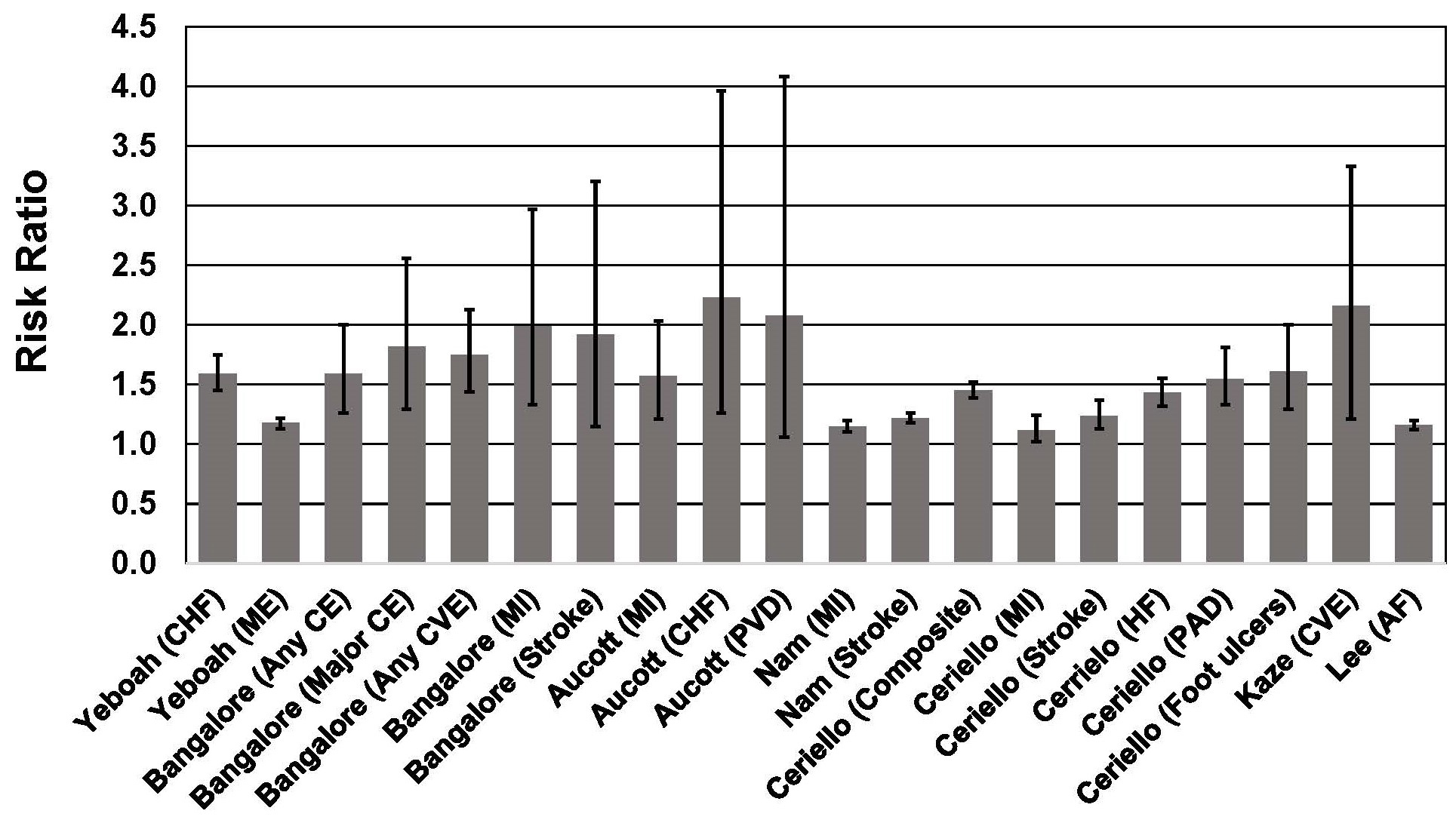 Fig. 3.Association between body weight fluctuation (weight cycling) and risk of adverse cardiovascular outcomes in individuals with type 2 diabetes. See text for description of studies. Vertical bars = 95% confidence intervals. AF, atrial fibrillation; CE, coronary event; CHF, congestive heart failure; Composite, Nonfatal myocardial infarction, nonfatal stroke, and all-cause mortality; CVE, cardiovascular event; HF, heart failure; ME, microvascular events; MI, myocardial infarction; PAD, peripheral artery disease; PVD, peripheral vascular disease.