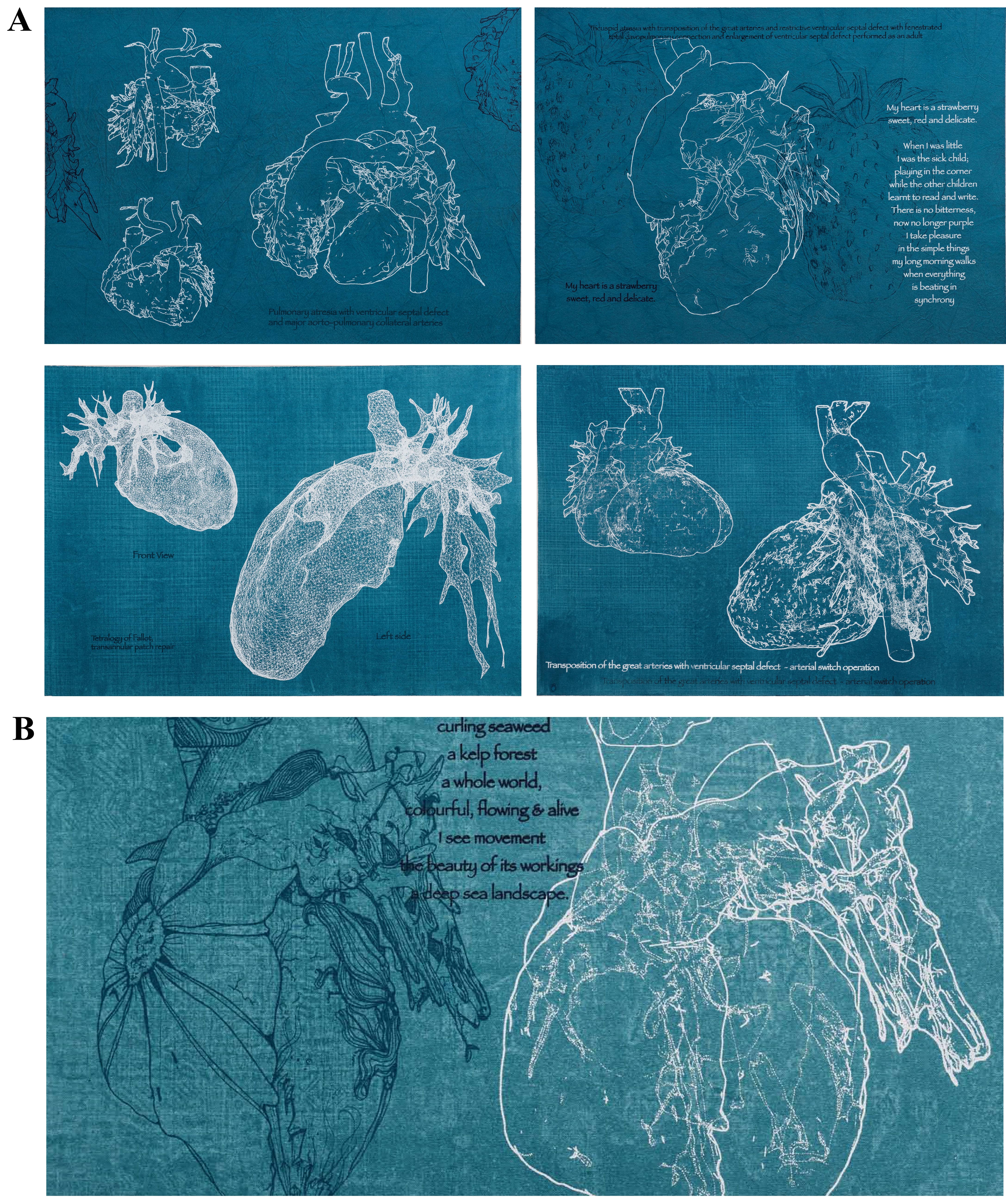 First and foremost, incorporating patient experience and language and individuals’ views into the artworks themselves results in stimulating and thought-provoking layering; the artwork can be entered in different ways, it can be seen from different angles, focusing on one element (e.g., medical vs non-specialist language, anatomical detail, metaphorical elements) but also reflecting on the experience(s) behind the piece. Whether individual, collective or composite [17], the narrative element adds the experiential and societal dimensions to illustrative, didactic and even autobiographical possibilities. Literature has also importantly shown that patients’ own representations are linked to functional outcomes. A study focusing on patients’ drawings of damage to their hearts following myocardial infarction showed that patients’ representations predicted recovery better than medical indicators of damage did [18], highlighting that drawings provided the clinician with valuable entry points to explore patients’ ideas and perceptions of their own cardiovascular health, including potential negative illness beliefs that could subsequently be discussed and rectified.