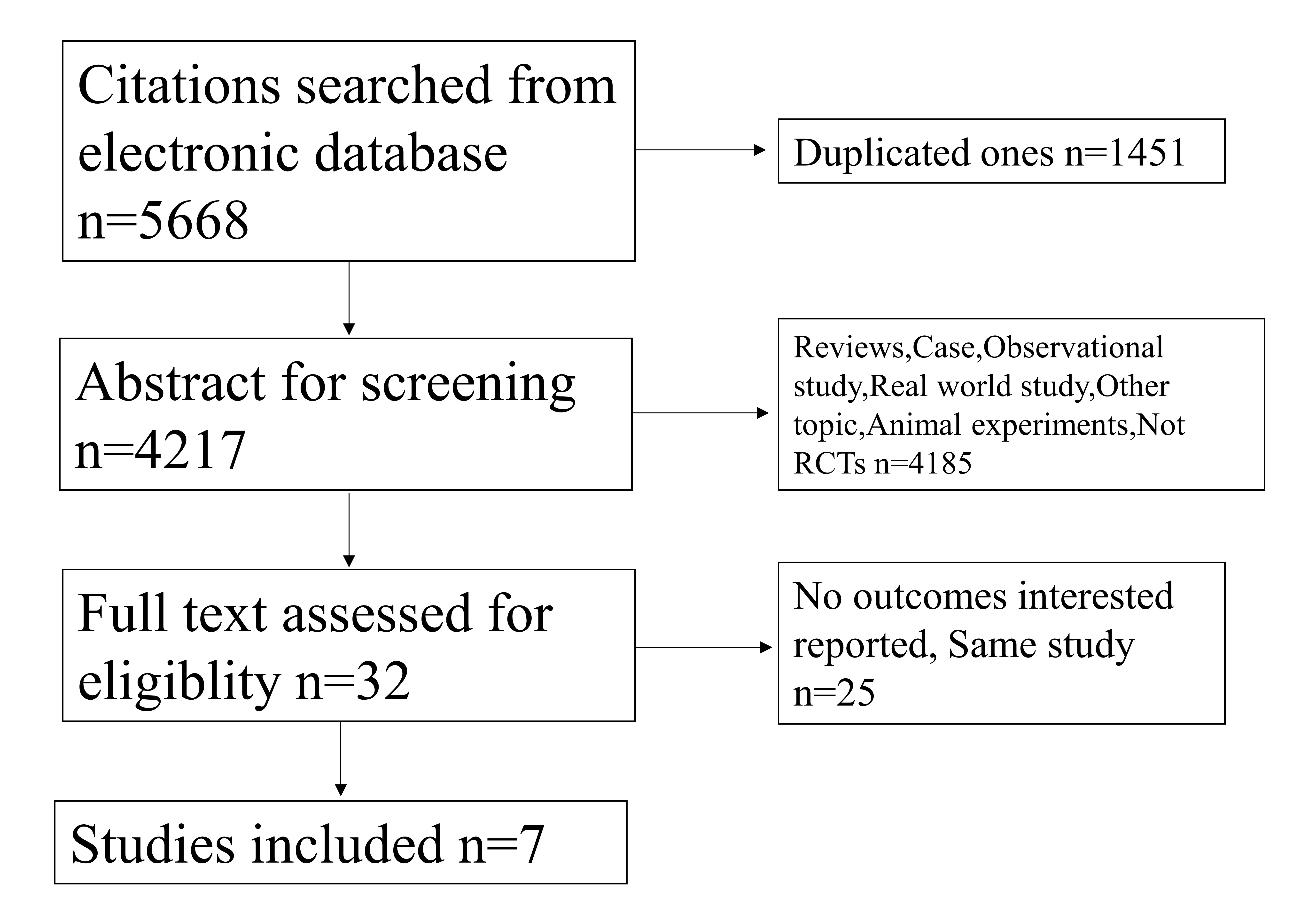 A total of 5668 citations were identified from varied sources including PubMed, Embase, Cochrane and manual searches. After deleting 1451 duplicates, we screened potentially eligible citations by browsing titles and abstracts. Reviews, case reports, observational studies, real world studies, other topics, animal experiments and non-RCTs involving 4185 citations were also excluded. We excluded 32 other citations by full-text assessment and finally, 7 studies were included in the meta-analysis (Fig. 1).