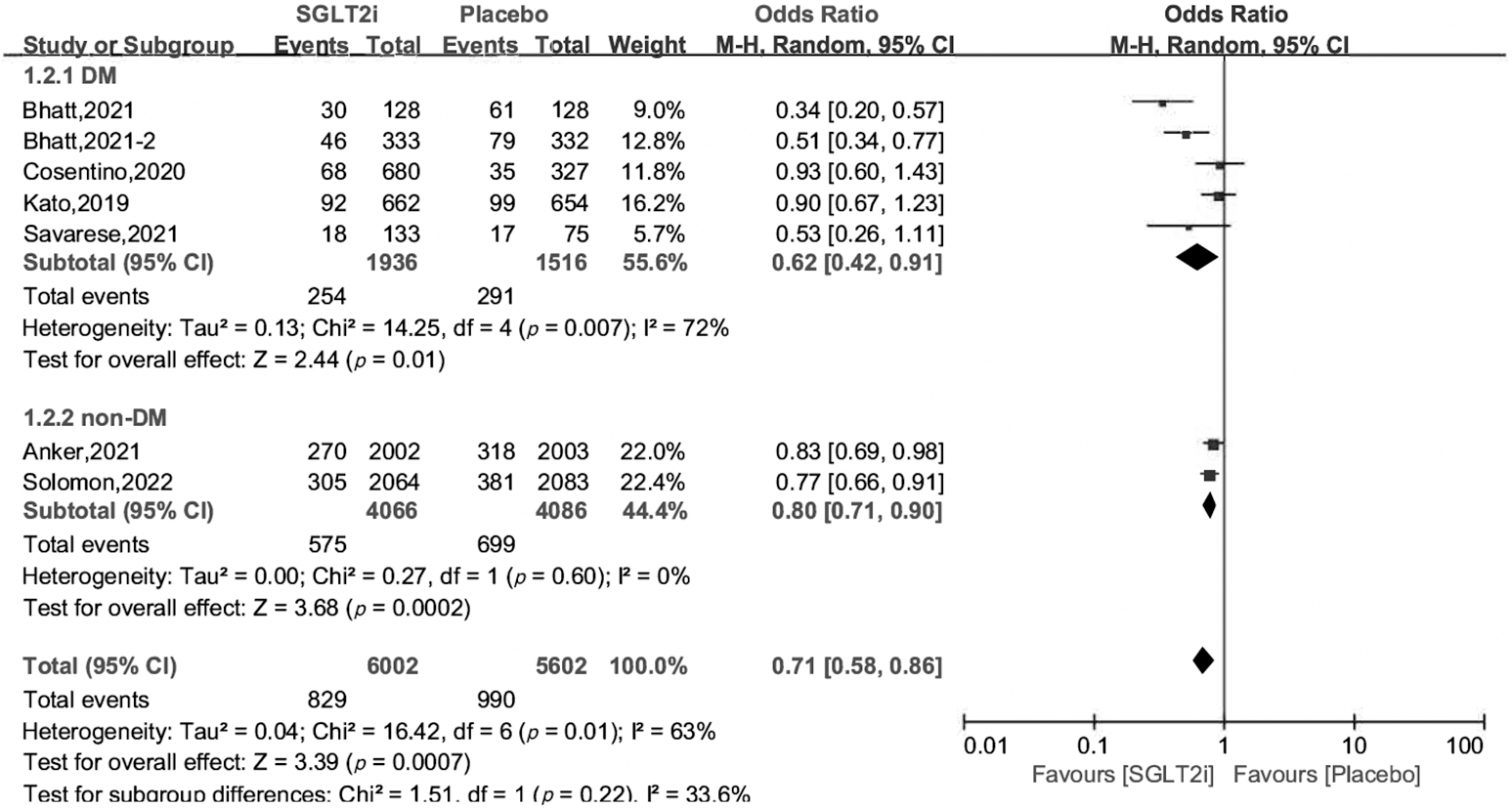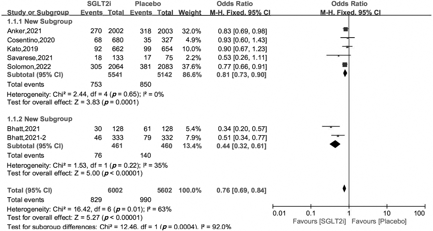 In the analysis on primary outcome, the heterogeneity across trials was 69%, indicating substantial heterogeneity. Considering the random effect model may weaken the real effects of SGLT2i versus placebo, we used the fixed effect model and divided the 7 trials into 2 subgroups to eliminate the potential heterogeneity. The heterogeneity across trials decreased to 0% and 35% from 69%, and the OR and 95% CI were 0.81 [0.73, 0.90], 0.44 [0.32, 0.61], respectively. The random effect model was also performed to further verify the efficacy of SGLT2i, and the OR and 95% CI were 0.71 [0.58, 0.86], p = 0.0007 (S4, Supplemental Materials). We performed an influence analysis by omitting one study every time, and found that the OR of SGLT2i versus placebo ranged from 0.65 to 0.87. These analyses show that our results were reliable.