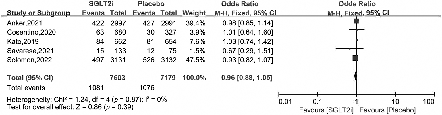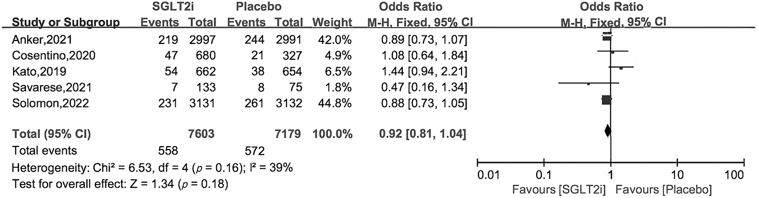 The odds ratios (ORs) and 95% confidence intervals (CIs) were calculated by Mantel-Haenszel analysis to investigate the effects of SGLT2i on HFpEF.
