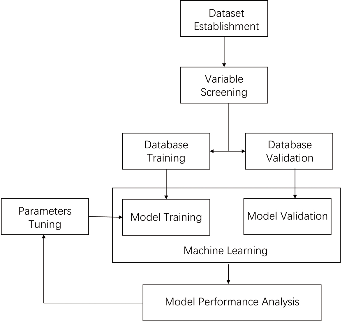 We used the XGBoost algorithm to build a in-hospital mortality predictive model for children with CHD. Dataset was devided into training set and testing set according to the 7.5:2.5 ratio. The training dataset was used for feature selection and model training, while the testing dataset was used for validation after model training. The importance of each feature was assessed using the recursive feature elimination (RFE) algorithm, and all features were sorted based on their level of importance. The RFE algorithm was used to recursively remove features and build a model on the remaining features. Among all possible combination of features, the model with the highest AUC was determined and the features included are eventually selected to build the XGBoost model. Furthermore, Grid Search was used to adjust the hyperparameters of model to reduce overfitting and improve the model accuracy. The stability of the model is tested by Bootstrap algorithm with random resampling of the samples, and 95% confidence interval (95% CI) was exported. Finally, we assessed the predictive power of the model using the area under the receiver operating characteristic curves (AUC), sensitivity, and specificity. Fig. 1 presents the whole process described above. The XGBoost was developed in Python language (version 3.7.6) with main packages scikit-learn (version 0.23.1) and XGBoost (version 1.1.1).