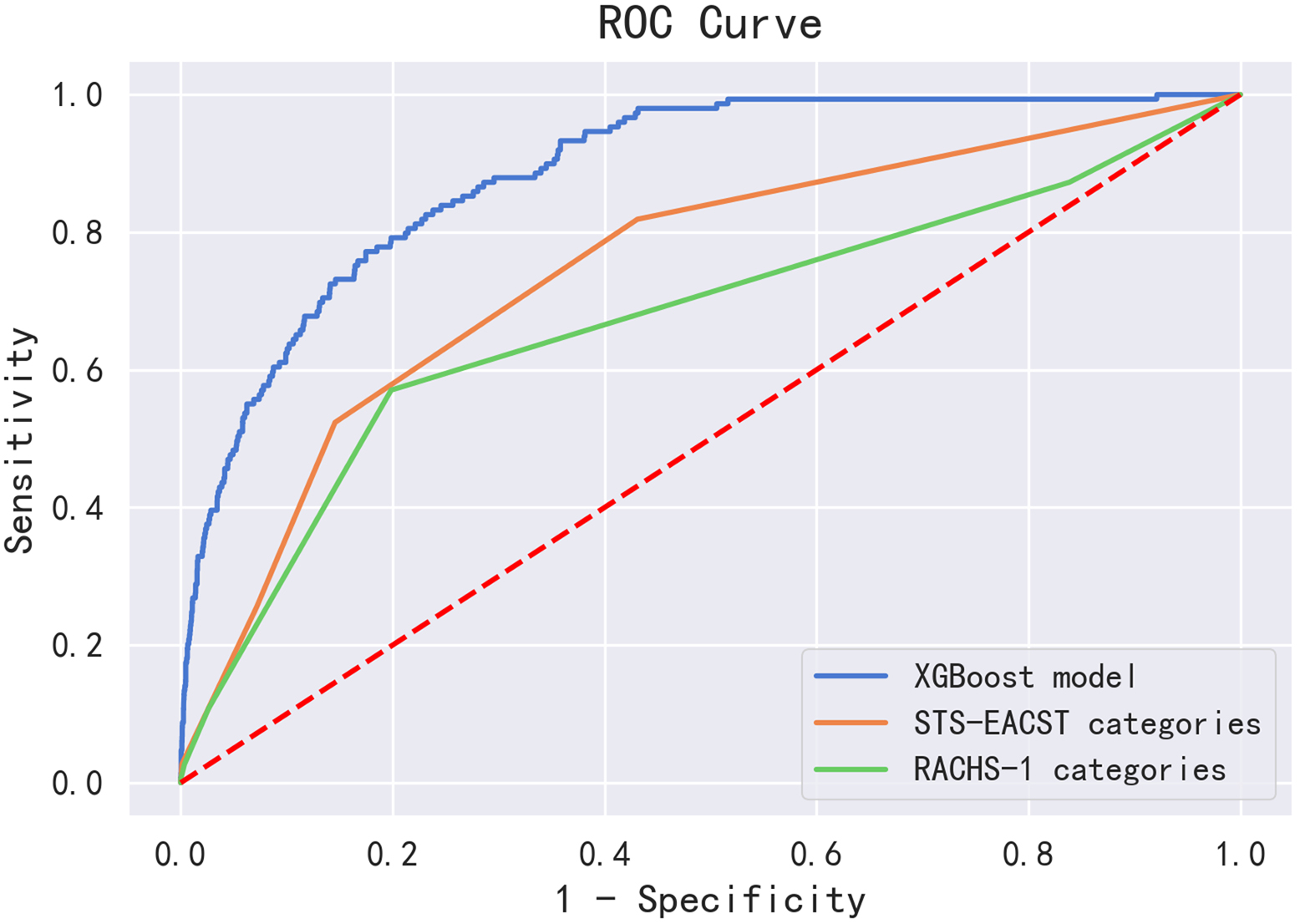 The performance of the XGBoost model, STS- EACTS, and RACHS-1 risk stratification categories in the testing set are shown in Table 3 and Fig. 2. The AUC of the STS-EACTS and RACHS-1 risk stratification categories was 0.748 (95% CI: 0.707–0.789) and 0.677 (95% CI: 0.627–0.728), respectively. Our XGBoost model yielded the best AUC (AUC = 0.887, 95% CI: 0.866–0.907), with a sensitivity and specificity of 0.785 and 0.824, respectively (Table 3).