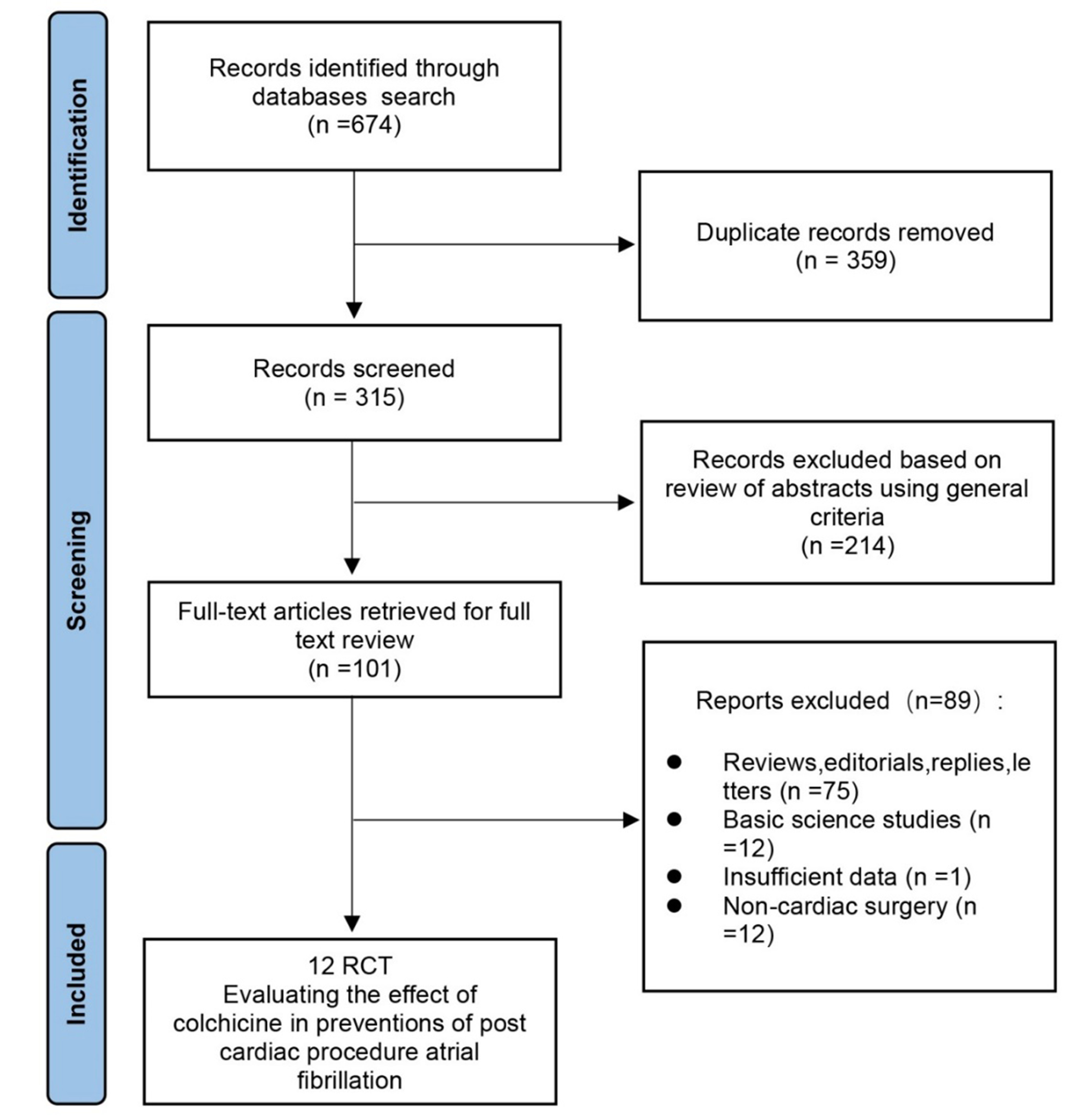 Atrial fibrillation is one of the most common arrhythmias in the clinic and has become a cardiovascular epidemic in the 21st century [1]. Atrial Fibrillation is related to cardiac procedures, including coronary artery bypass graft, valve surgery, aortic surgery, and pulmonary vein isolation [2]. PCP-AF will increase the length of hospital stay, mortality, and economic burden, so the prevention and treatment of post-operative atrial fibrillation are critical [3, 4]. The pathogenesis of atrial fibrillation is complex, and inflammation plays an important role. Inflammation after cardiac operation and radiofrequency ablation is closely related to PCP-AF [5]. As a classic anti-inflammatory drug, colchicine may be a potential drug for the prevention and treatment of PCP-AF. Previous studies have demonstrated the preventive effect of colchicine on PCP-AF [6, 7]. However, other studies have shown that colchicine doesn’t significantly reduce the incidence of PCP-AF, and colchicine is related to more adverse reactions [8, 9]. Therefore, the benefit of colchicine to post-operative patients cannot be determined. This study analyzed the feasibility and safety of colchicine in preventing PCP-AF by integrating relevant data from various RCTs.