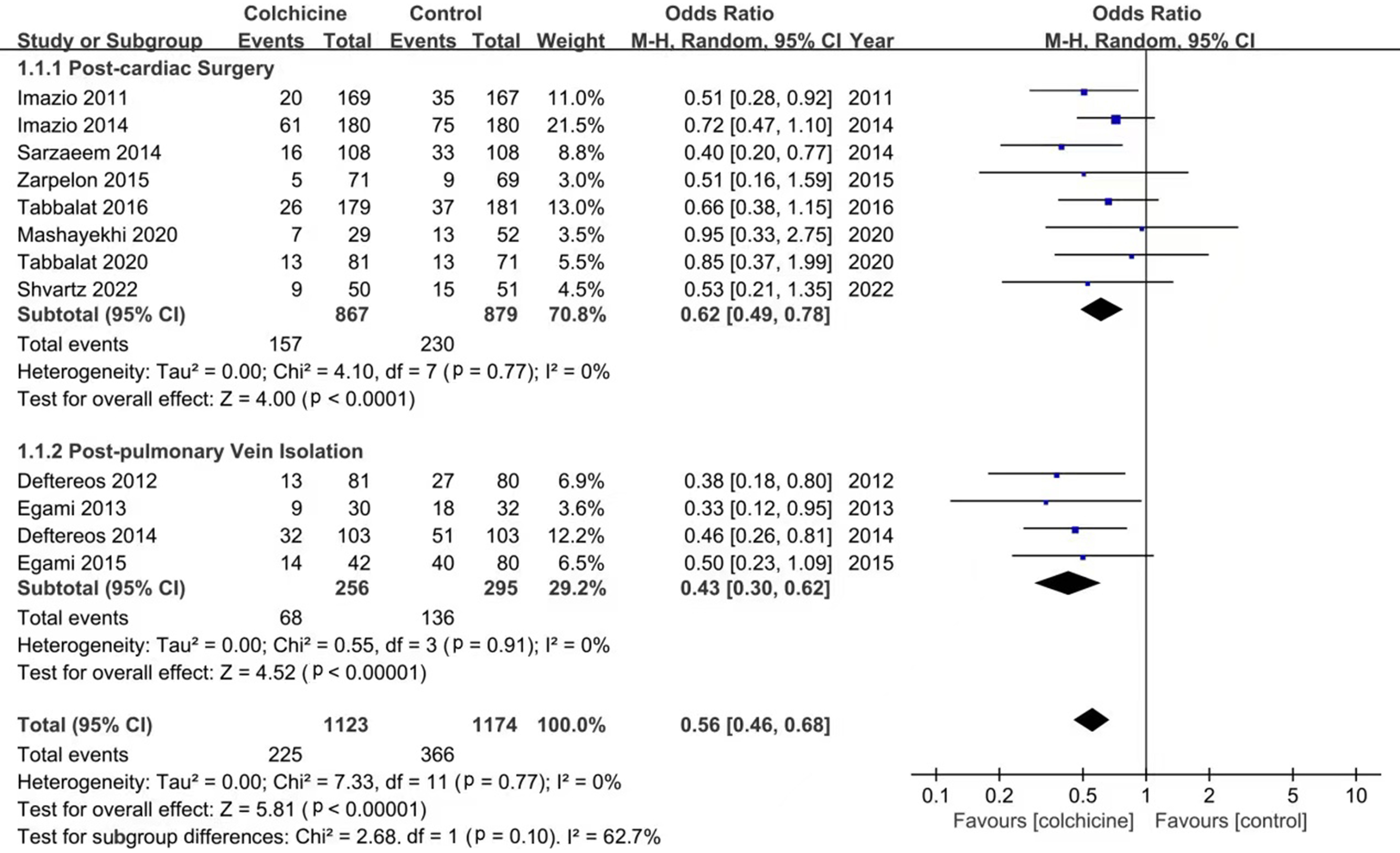 This meta-analysis based on 12 RCTs showed that perioperative use of colchicine significantly reduced the incidence of PCP-AF. Our results are consistent with previous meta-analyses and confirm the effect of colchicine on PCP-AF [20, 21, 22]. This study is the largest meta-analysis to date, involving 2297 patients, of whom 1746 underwent cardiac surgery, and 551 underwent pulmonary vein isolation. Subgroup analysis of cardiac surgery and radiofrequency ablation also suggests that colchicine effectively prevents atrial fibrillation.