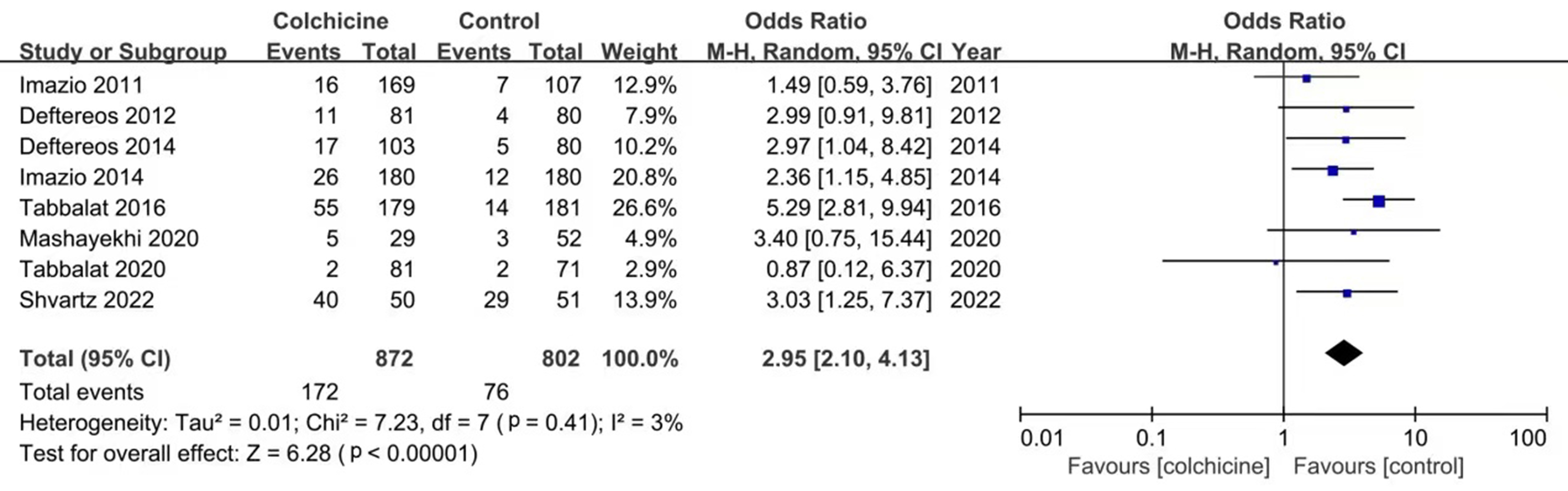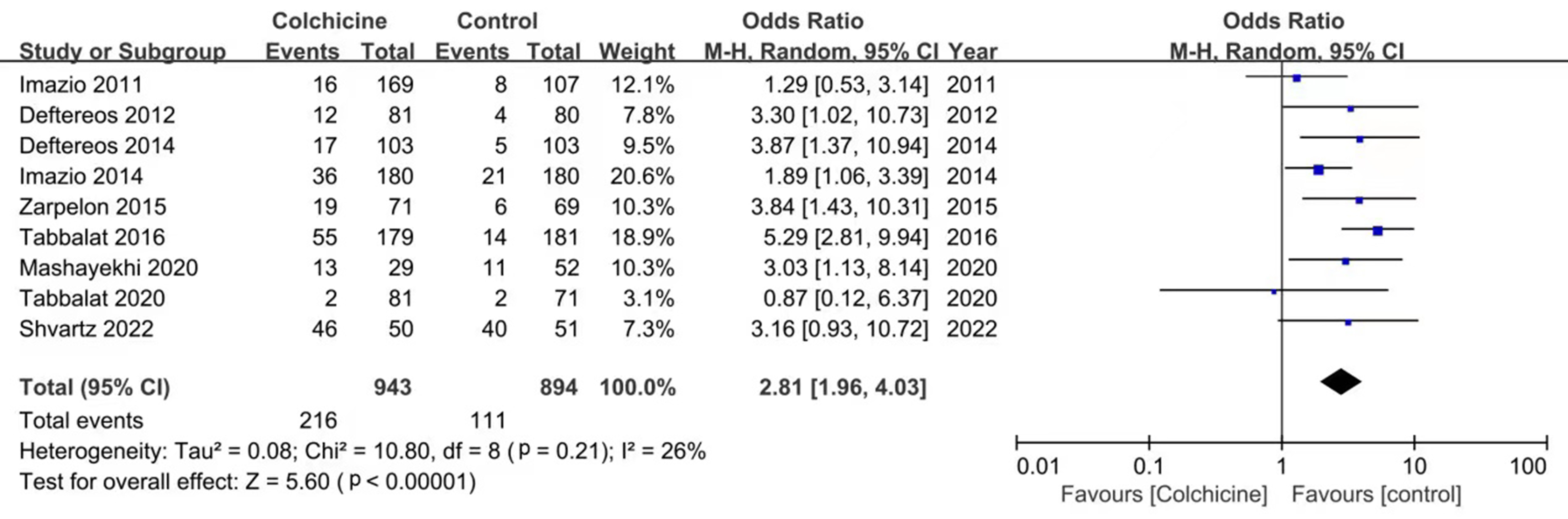 the colchicine group (OR: 2.81; 95% CI: 1.96–4.03, p