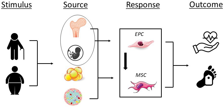 Fig. 1.Impact of aging, obesity, and disease on endothelial progenitor (EPCs) and mesenchymal stromal cell number (MSCs) and/or function and the potential for adverse cardiovascular events and all-cause mortality. Stimulus; aging, obesity; Source, bone marrow, umbilical cord blood, adipose tissue, pancreatic islet; Response, decrease in EPC and MSC number and/or function; Outcome, adverse cardiovascular events, all-cause mortality.