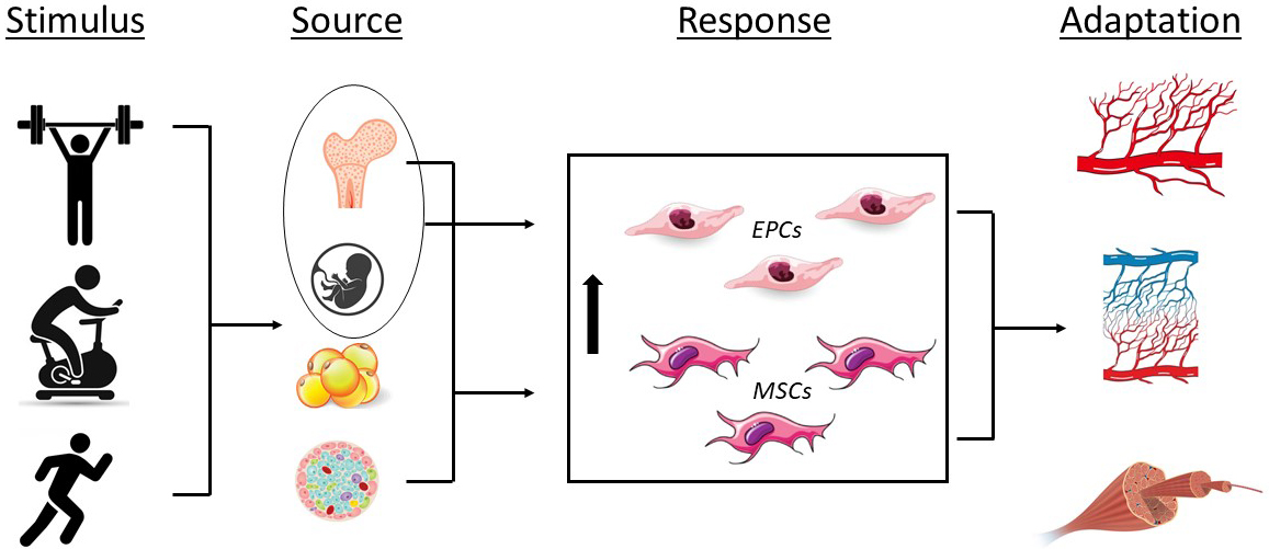 Fig. 2.Effects of exercise on endothelial progenitor (EPCs) and mesenchymal stromal cells (MSCs) and the associated physiological adaptations. Stimulus; resistance exercise, cycling, running; Source, bone marrow, umbilical cord blood, adipose tissue, pancreatic islet; Response, increase in EPC and MSC number and/or function; Adaptation, angiogenesis, capillarization, skeletal muscle tissue repair.