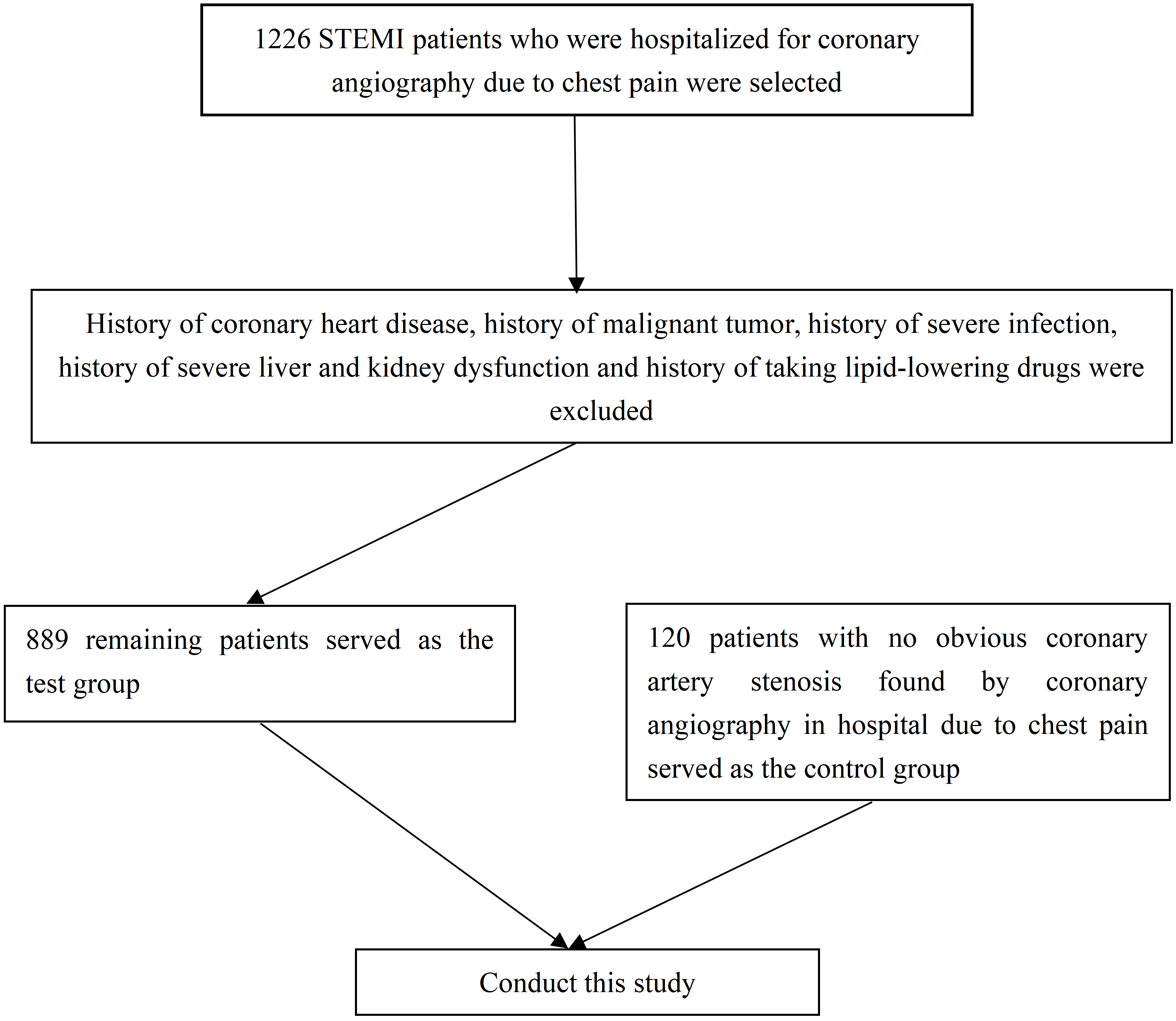 1226 STEMI patients with chest pain who had been hospitalized for coronary angiography were selected. All patients with a history of coronary heart disease, malignant tumor, severe infection, severe liver and kidney dysfunction, or of taking lipid-lowering drugs were excluded. 889 remaining STEMI patients served as the test group and 120 patients with less than 50% coronary stenosis were selected as the control group (Fig. 1). The diagnostic criteria refer to the “Global Definition of the Fourth Myocardial Infarction” promulgated in 2018 [12]. The sex, age, history of diabetes, history of hypertension, smoking habits, height, and weight of each patient was recorded. All of the selected patients underwent blood tests, electrocardiograms, and coronary angiography upon admission. A full lipid profile blood test was performed the next morning. Two doctors detailed the location and stenosis of each patient’s coronary artery disease. The degree of coronary artery disease was measured using the Gensini score. Whenever there was any disagreement, a third physician would join the discussion in order to help come to a decision. Non-HDL-C equals total cholesterol (TC) minus HDL-C, and NHHR equals non-HDL-C divided by HDL-C.