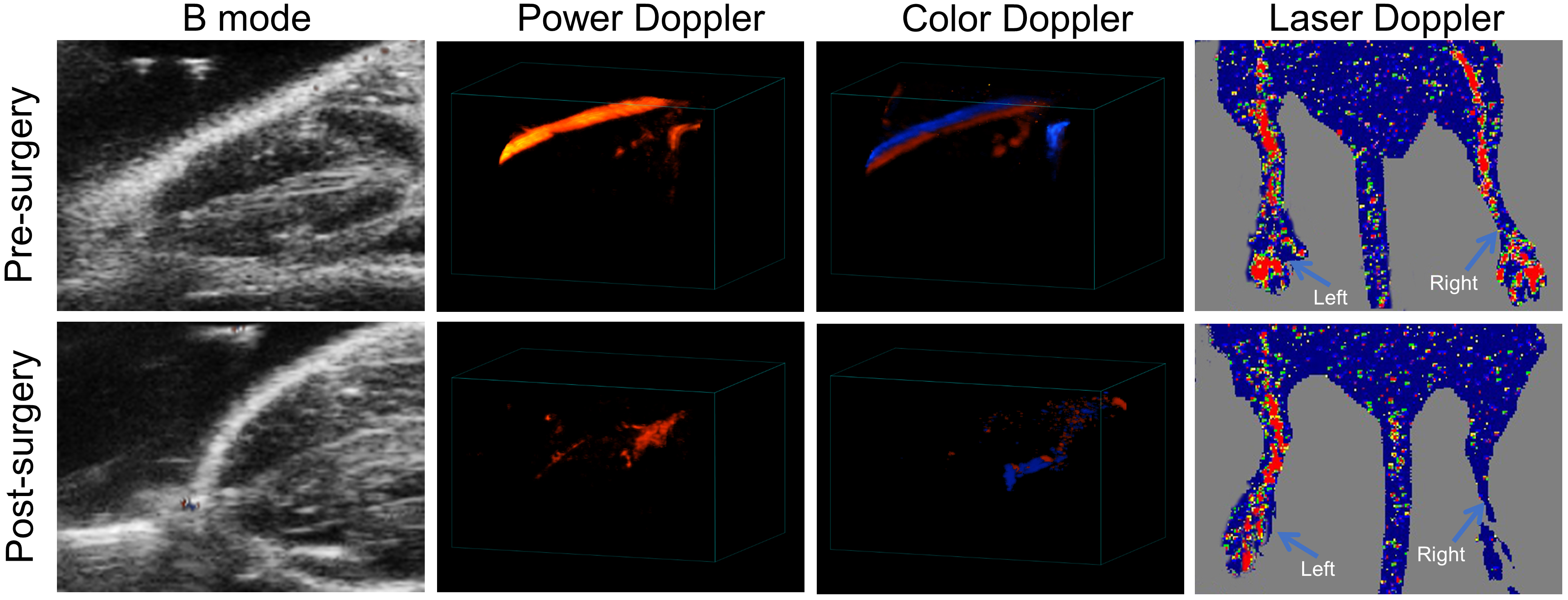 To detect the blood flow in hindlimbs, power Doppler and color Doppler scans