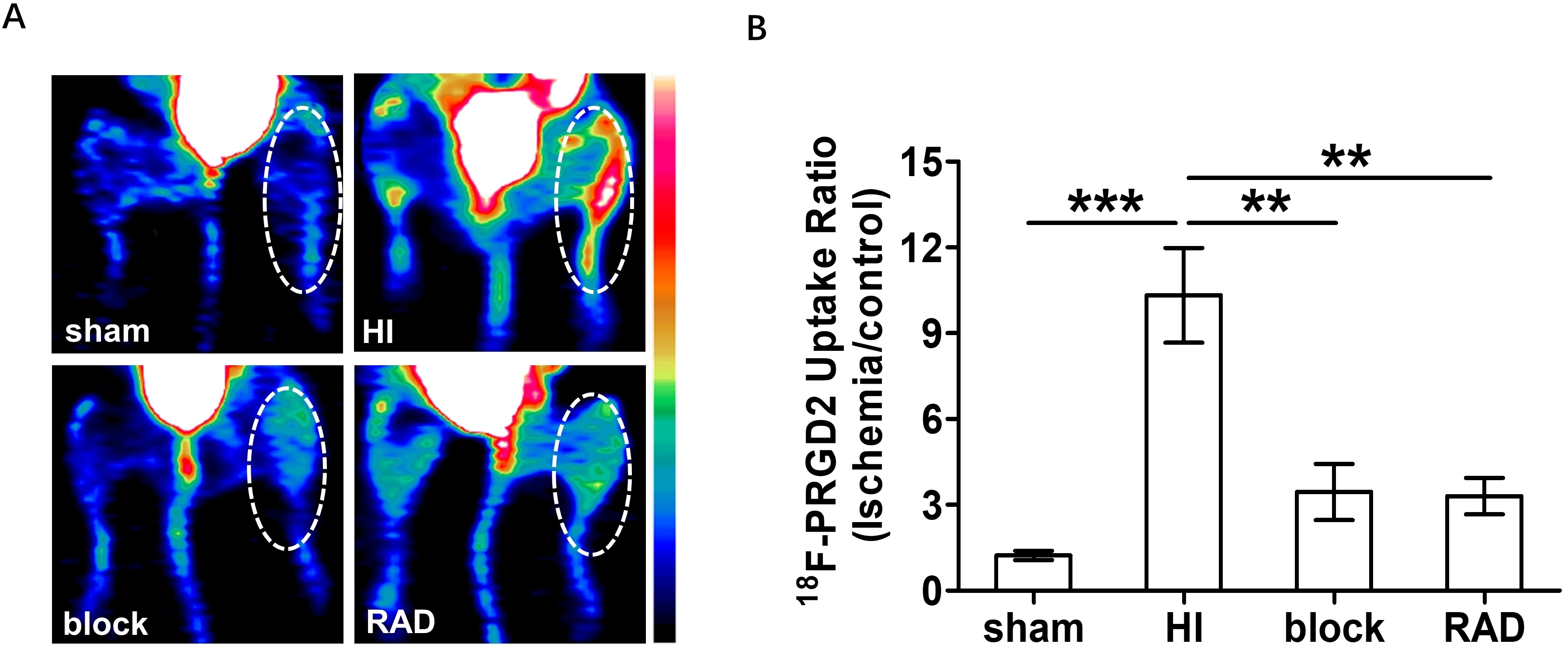 F-PRGD2 displayed a similar pattern of tracer uptake in the ischemic