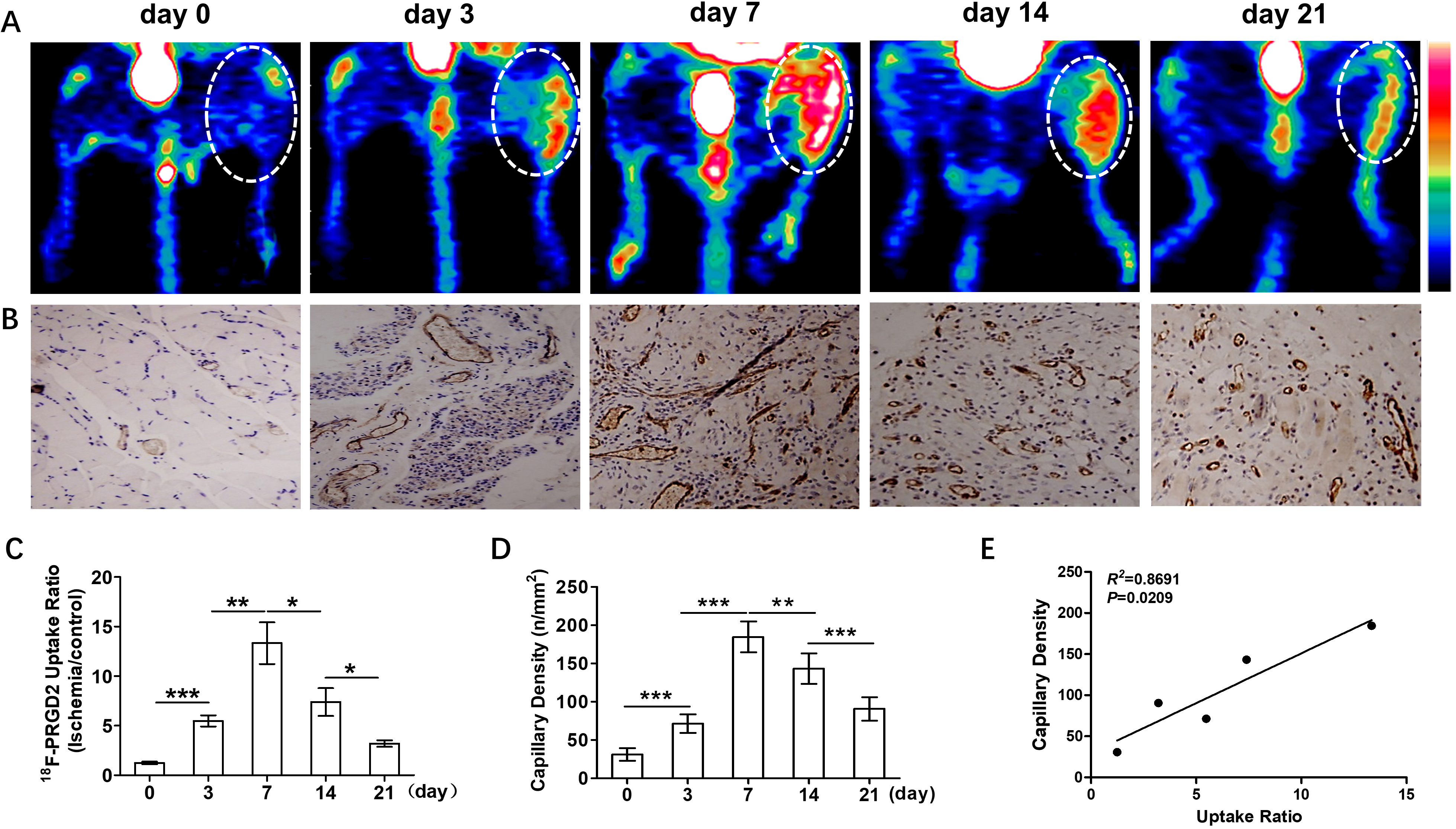 In this study, we established a mouse hindlimb ischemia (HI) model and microPET