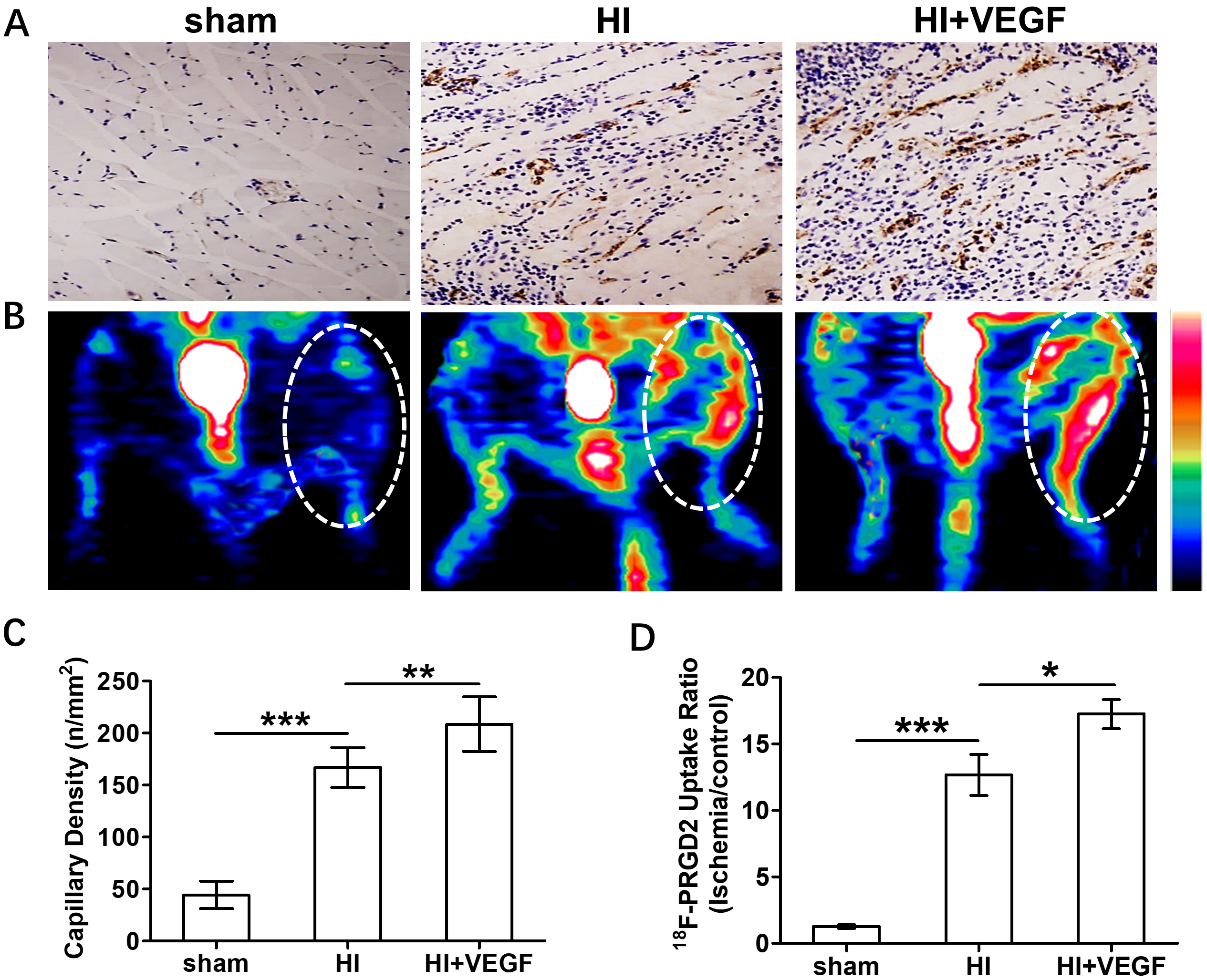 When VEGF treatment was applied, the F-PRGD2 uptake in the ischemic area