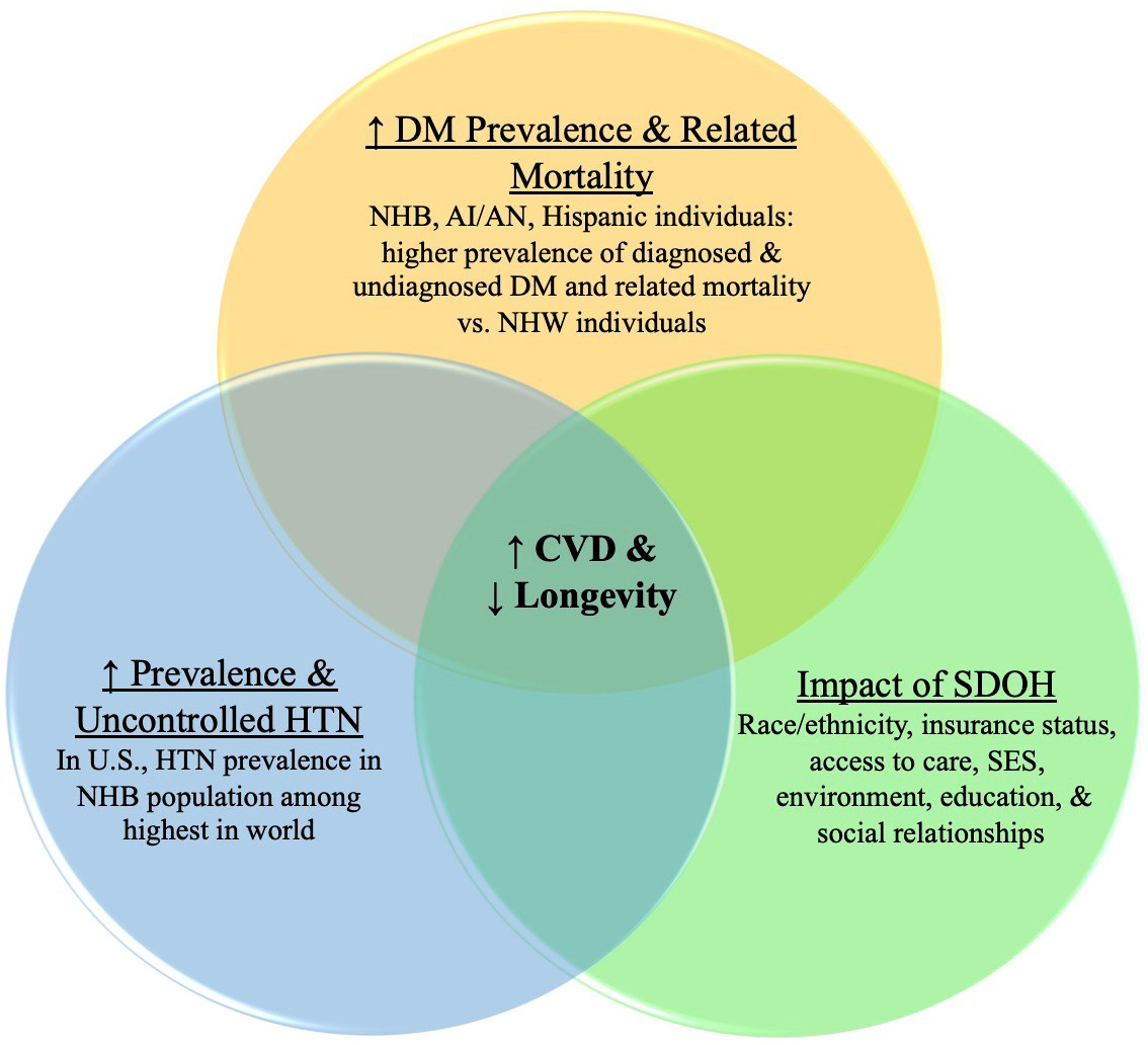 Fig. 1.Predominant factors affecting cardiometabolic/CV burden and longevity in racial/ethnic populations. The combination and amplification of multiple negative factors in racial/ethnic populations increases CVD and decreases longevity. NHB, non-Hispanic Black; AI/AN, American Indian/Alaska Native; NHW, non-Hispanic White; DM, Diabetes; HTN, Hypertension; SDOH, Social determinants of health; SES, Socioeconomic status.