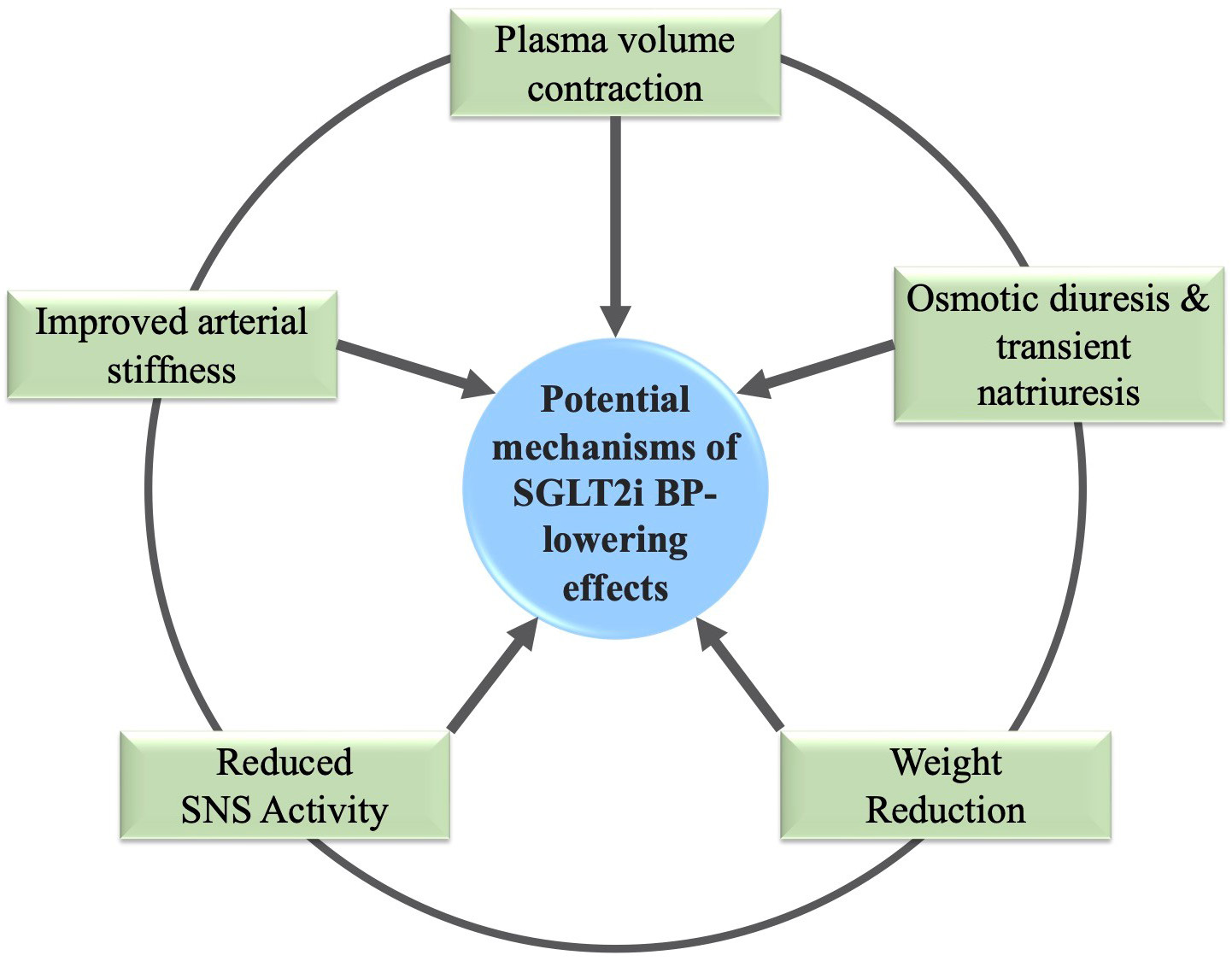Fig. 2.Blood Pressure-Lowering Effects of SGLT2is. SGLT2is impact many different physiologic processes that potentially contribute to their BP-lowering effects. BP, Blood pressure; SNS, Sympathetic nervous system.