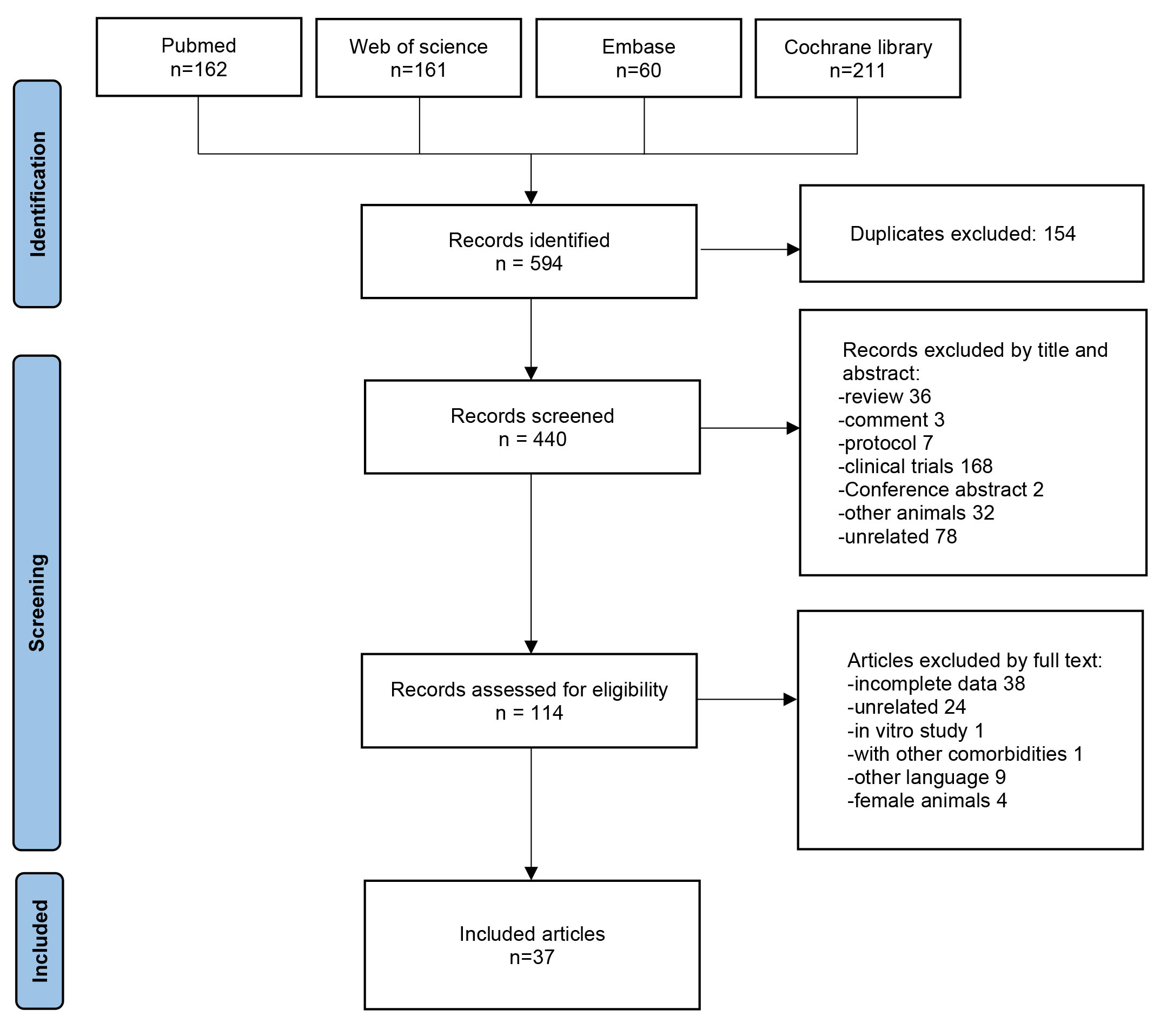 A total of 594 studies were identified from PubMed, Web of Science, Embase, and Cochrane Library databases. After removing duplicates, 440 studies underwent title and abstract screening, and 326 were excluded. The full texts of the remaining 114 studies were assessed. Seventy-seven studies were excluded; 38 owing to incomplete data, 24 owing to unrelated data, 1 was an in vitro study, 1 reported on other comorbidities, 9 were in another language, and 4 were on female animals. Finally, 37 articles were included in the quantitative synthesis [14, 15, 16, 17, 18, 19, 20, 21, 22, 23, 24, 25, 26, 27, 28, 29, 30, 31, 32, 33, 34, 35, 36, 37, 38, 39, 40, 41, 42, 43, 44, 45, 46, 47, 48, 49, 50] (Fig. 1).