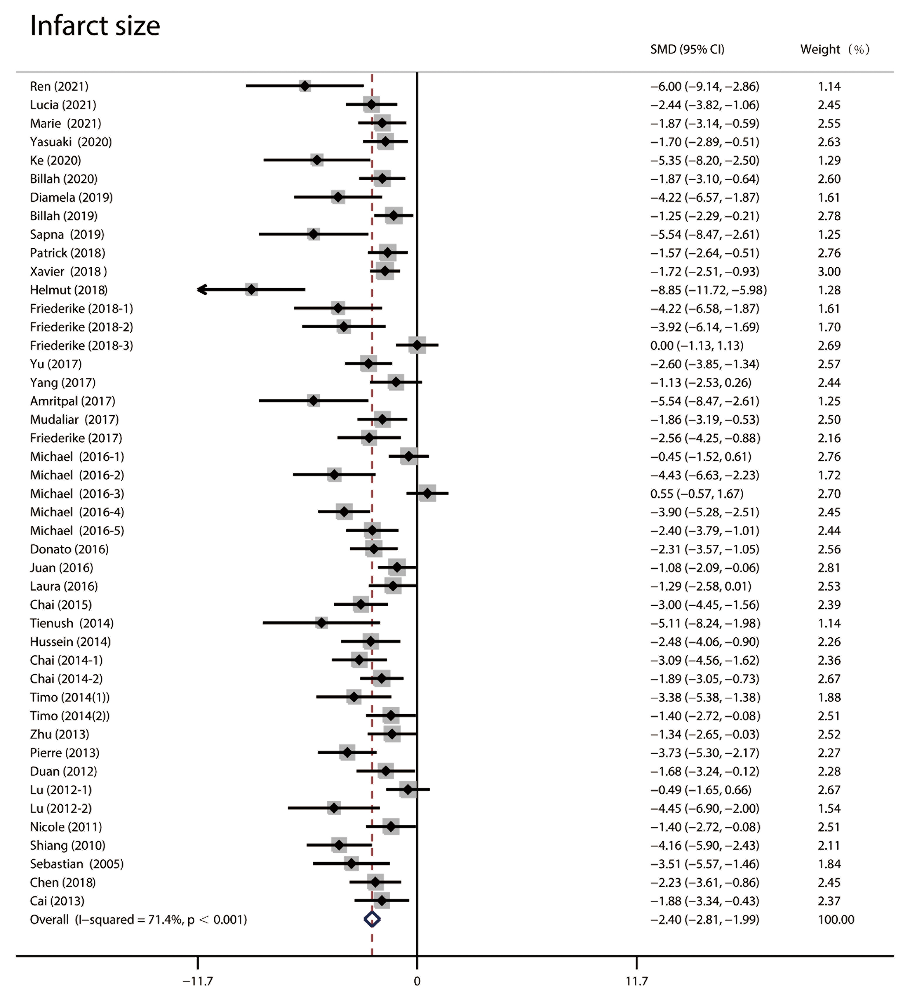 This study had several limitations, which should be mentioned. First, evaluation might be influenced by high heterogeneity owing to differences between animal experiments; better-performed studies with particular emphasis on the detailed characterization of RIPC protocols and analysis are warranted. In addition, we did not include studies with female animals because endogenous estrogen was suggested to limit cardiomyocyte apoptosis from MIRI by producing a baseline anti-apoptotic profile; further studies could focus on the potential effect of sex [72]. Moreover, only studies in rats and mice were analyzed. The potential benefits of RIPC in larger species and the presence of comorbidities need to be investigated before studies in humans.