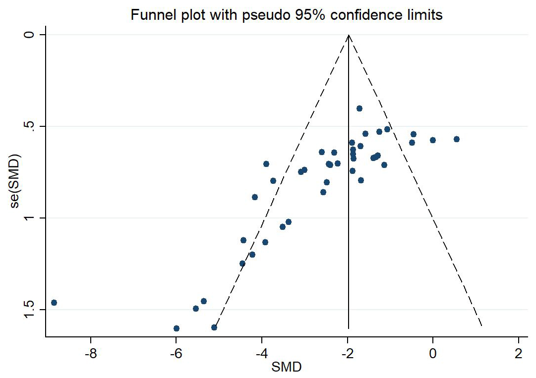 Fig. 3.Assessment of publication bias by Funnel plot. The dotted line indicated the standardized mean difference (SMD). The funnel plot was unsymmetric and indicated the existence of publication bias. SMD, standardized mean difference.