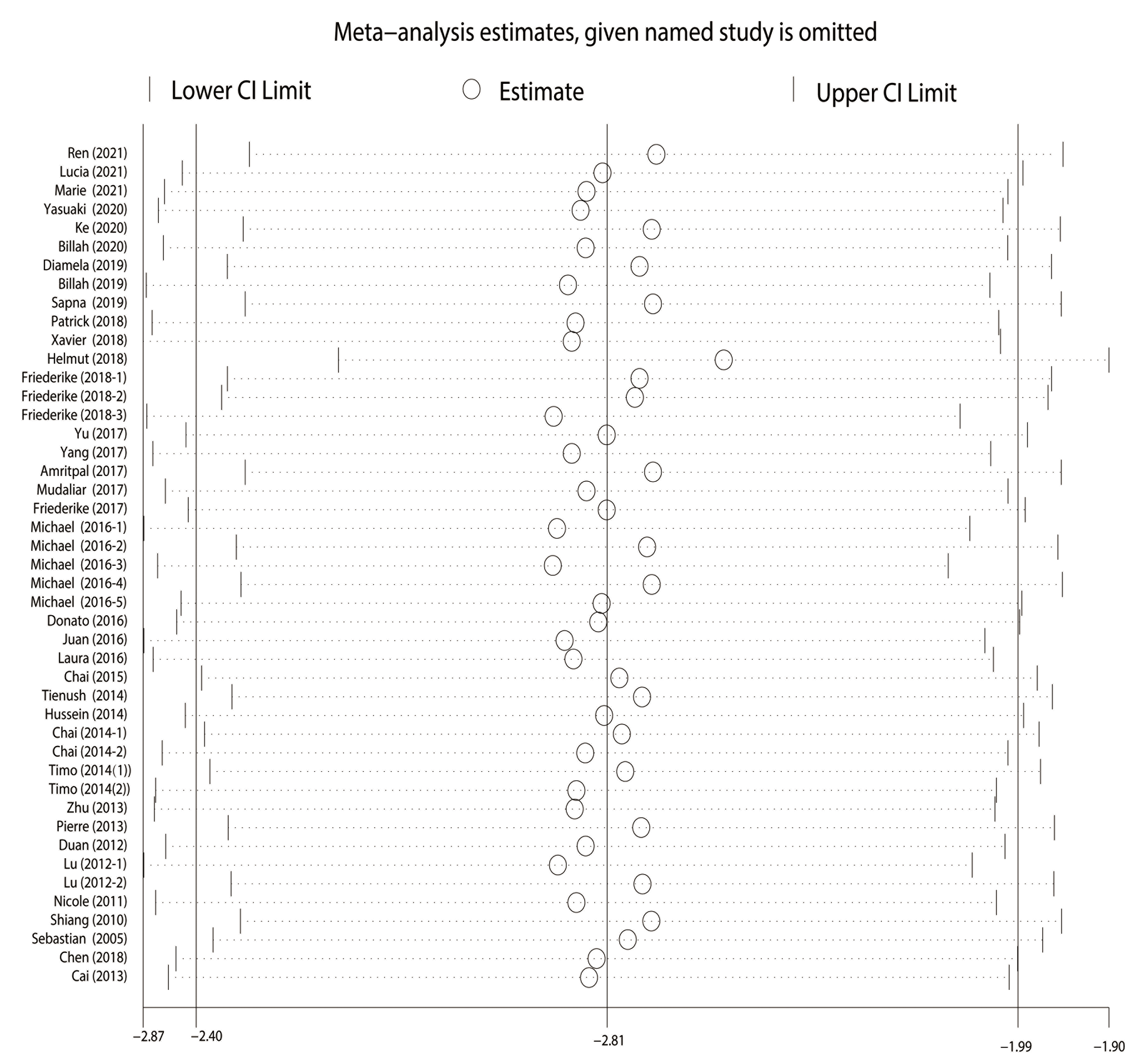 Fig. 4.Sensitivity analysis. The round shape represented the estimated pooled effect when a given named study was omitted. The vertical line indicated the lower and upper confidence interval (CI) limit.