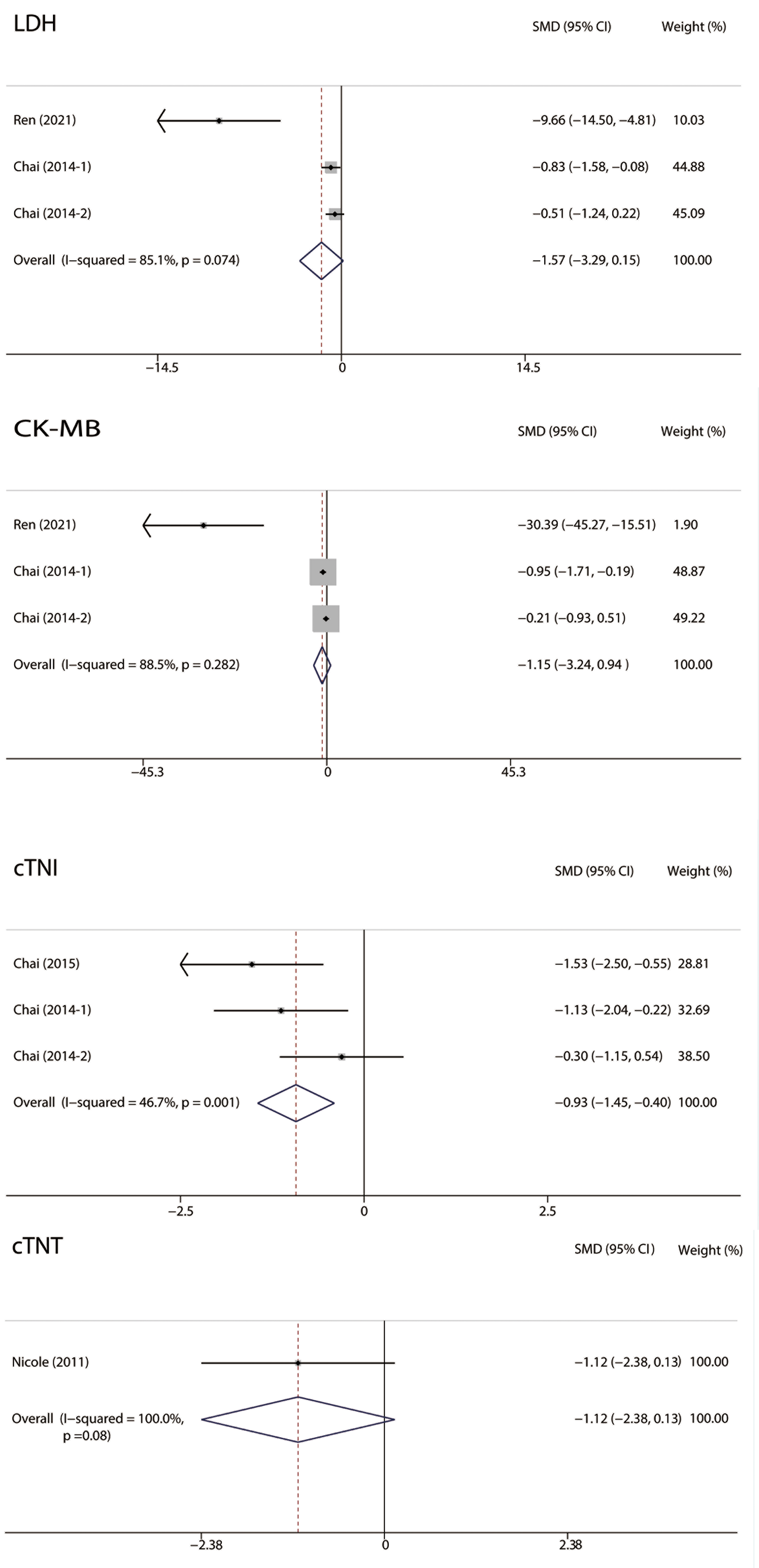 Fig. 5.Forest plots of Serum cardiac markers. RIPC was related to significantly lower cTNI levels in MIRI. No significant difference was observed in LDH, CK-MB, and cTNT between the two groups. RIPC, remote Ischemic preconditioning; MIRI, myocardial ischemia-reperfusion injury; CI, confidence interval; CK, creatine kinase; cTNI, cardiac troponin I; cTNT, cardiac troponin T; LDH, lactate dehydrogenase; SMD, standardized mean difference.